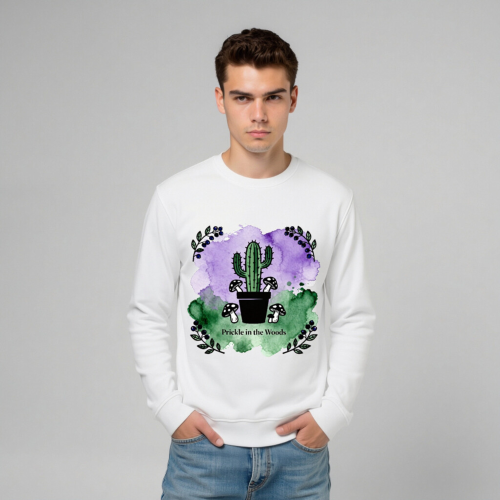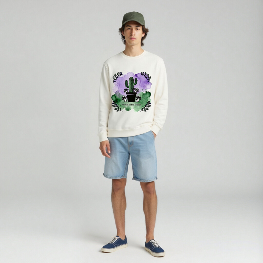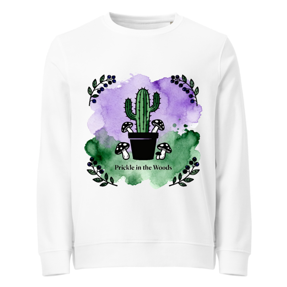 Wear nature’s charm with this unisex organic sweatshirt—featuring a whimsical ‘Prickle in the Woods’ design: a potted cactus, woodland mushrooms, and berry vines on soft purple-green watercolor. Made from certified organic cotton (verified by GOTS), it’s comfortable, sustainable, and perfect for eco-conscious fashion lovers seeking unique, artistic apparel.