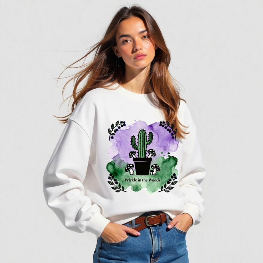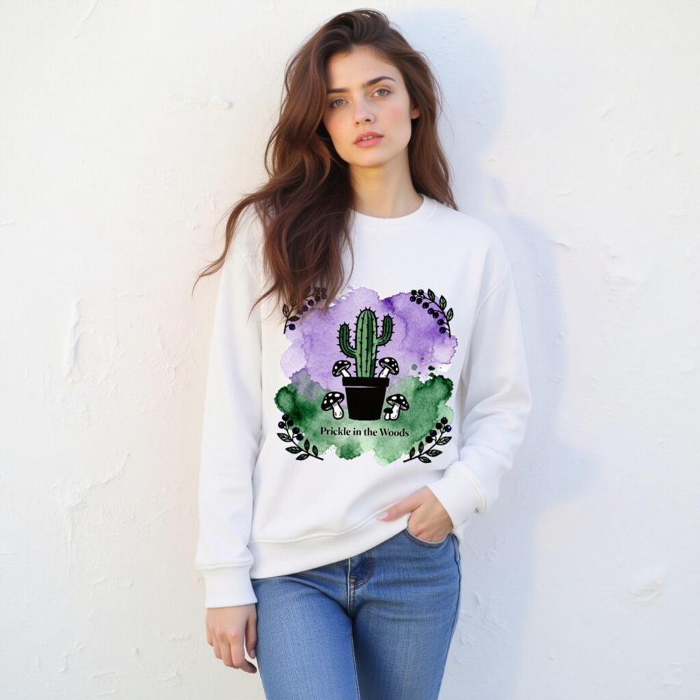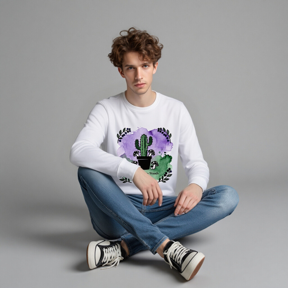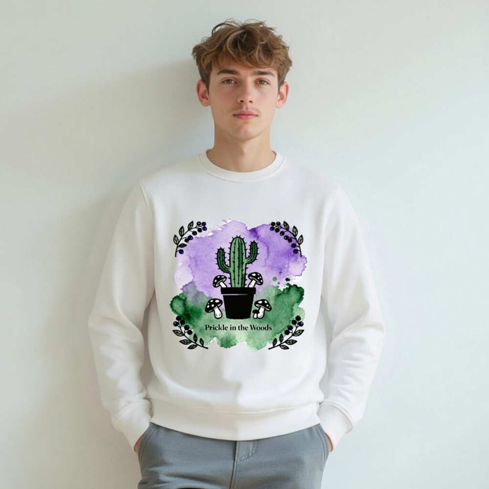 Wear nature’s charm with this unisex organic sweatshirt—featuring a whimsical ‘Prickle in the Woods’ design: a potted cactus, woodland mushrooms, and berry vines on soft purple-green watercolor. Made from certified organic cotton (verified by GOTS), it’s comfortable, sustainable, and perfect for eco-conscious fashion lovers seeking unique, artistic apparel.