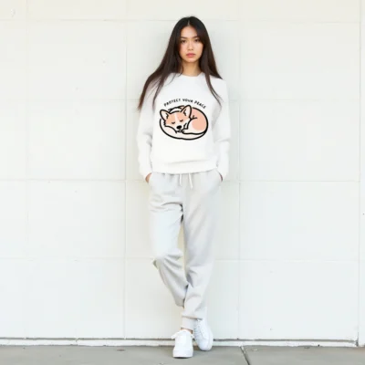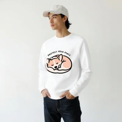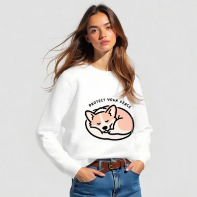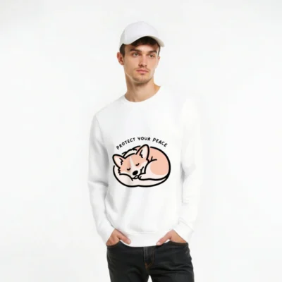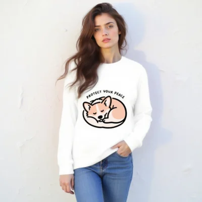 Soft, eco-friendly unisex organic sweatshirt featuring a cozy sleeping corgi with the uplifting message ‘Protect Your Peace’. Made from certified organic cotton for comfort and sustainability. Perfect for daily wear, gifting, or self-care moments. Machine washable, ethically produced, and designed to bring calm into your day.