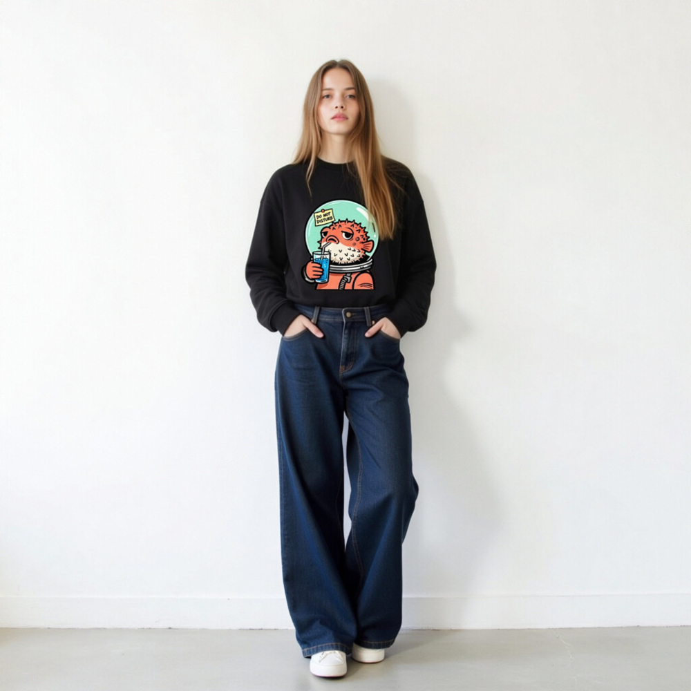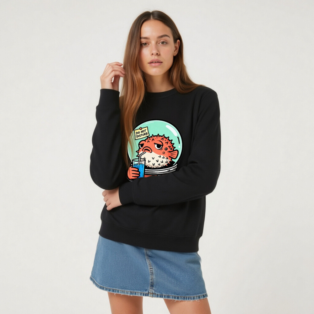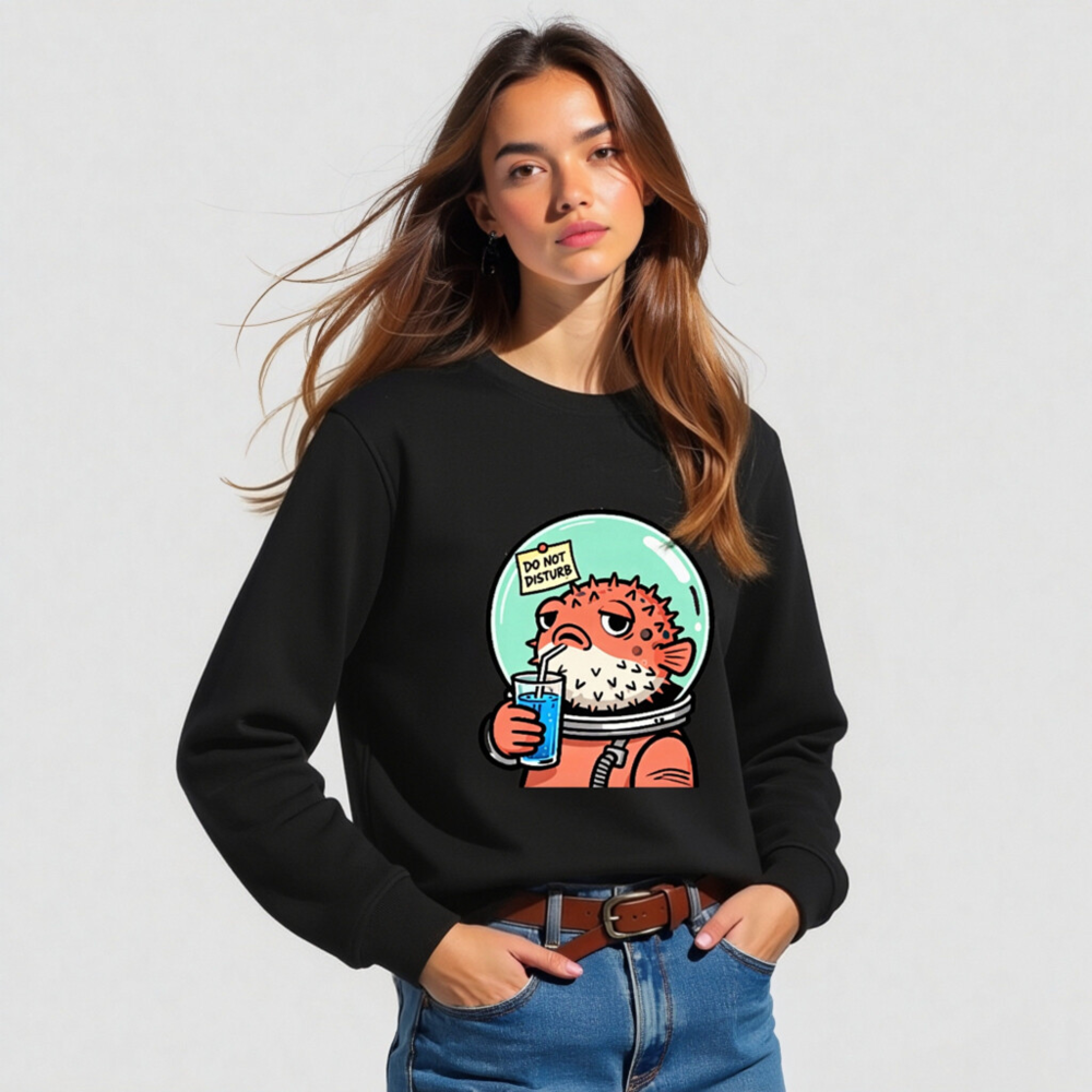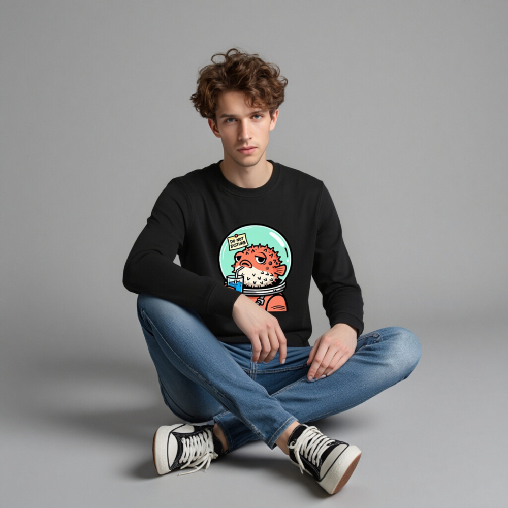 Wear this unisex organic sweatshirt featuring a charming pufferfish in an astronaut suit sipping blue juice with a ‘Do Not Disturb’ sign—perfect for space lovers and quirky fashion. Made from certified organic cotton, it’s soft, sustainable, and designed for comfort. Ideal for casual wear or gifting. Eco-friendly, ethical, and stylish.