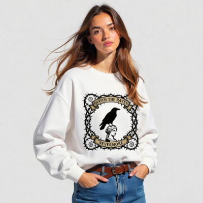This unisex organic sweatshirt features a striking black raven perched atop a classical bust, framed by intricate thorn vines and vintage banners reading ‘Quoth the Raven’ and ‘Nevermore’. Made from certified organic cotton, it offers comfort, sustainability, and literary gothic charm. Ideal for fans of Poe, dark academia, and timeless symbolism.
