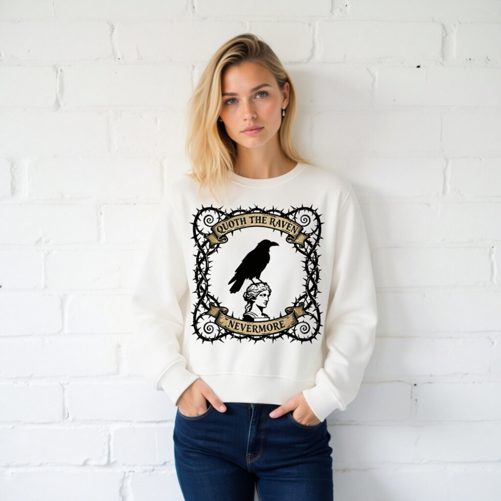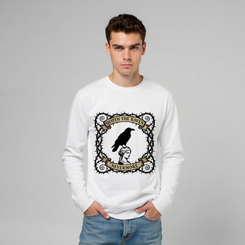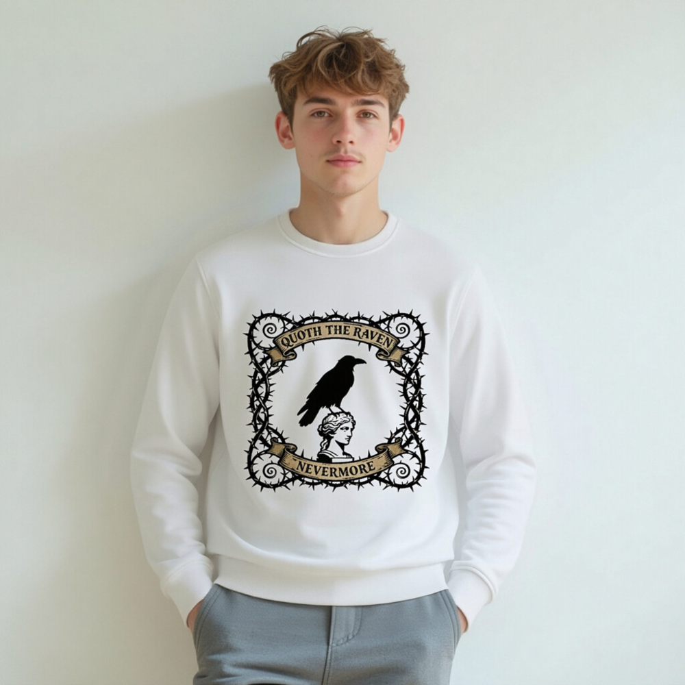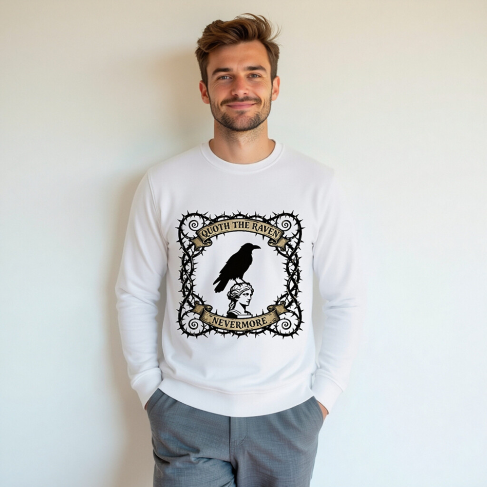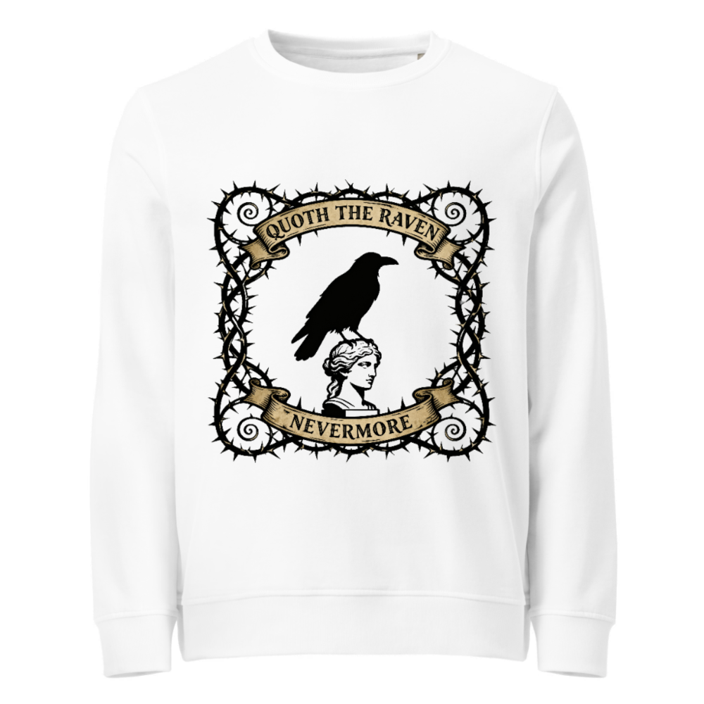 This unisex organic sweatshirt features a striking black raven perched atop a classical bust, framed by intricate thorn vines and vintage banners reading ‘Quoth the Raven’ and ‘Nevermore’. Made from certified organic cotton, it offers comfort, sustainability, and literary gothic charm. Ideal for fans of Poe, dark academia, and timeless symbolism.