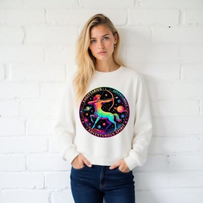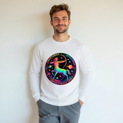 Wear the cosmic energy of Sagittarius with this unisex organic sweatshirt featuring a vibrant rainbow centaur archer against a starry galaxy backdrop. Crafted from certified organic cotton, it’s soft, sustainable, and perfect for adventurers. The bold circular design includes ‘SAGITTARIUS’ and ‘ADVENTUROUS SPIRIT’—a stylish statement piece for astrology lovers. Eco-friendly, comfortable, and ready for your next journey.
