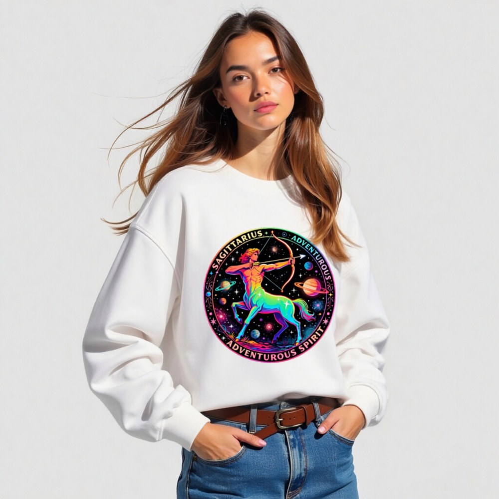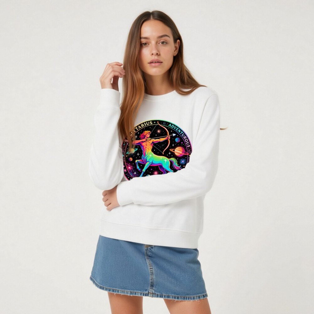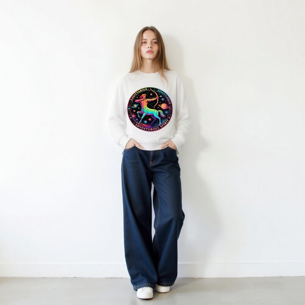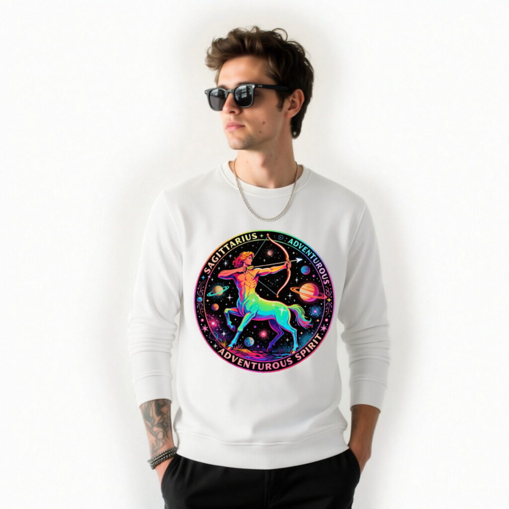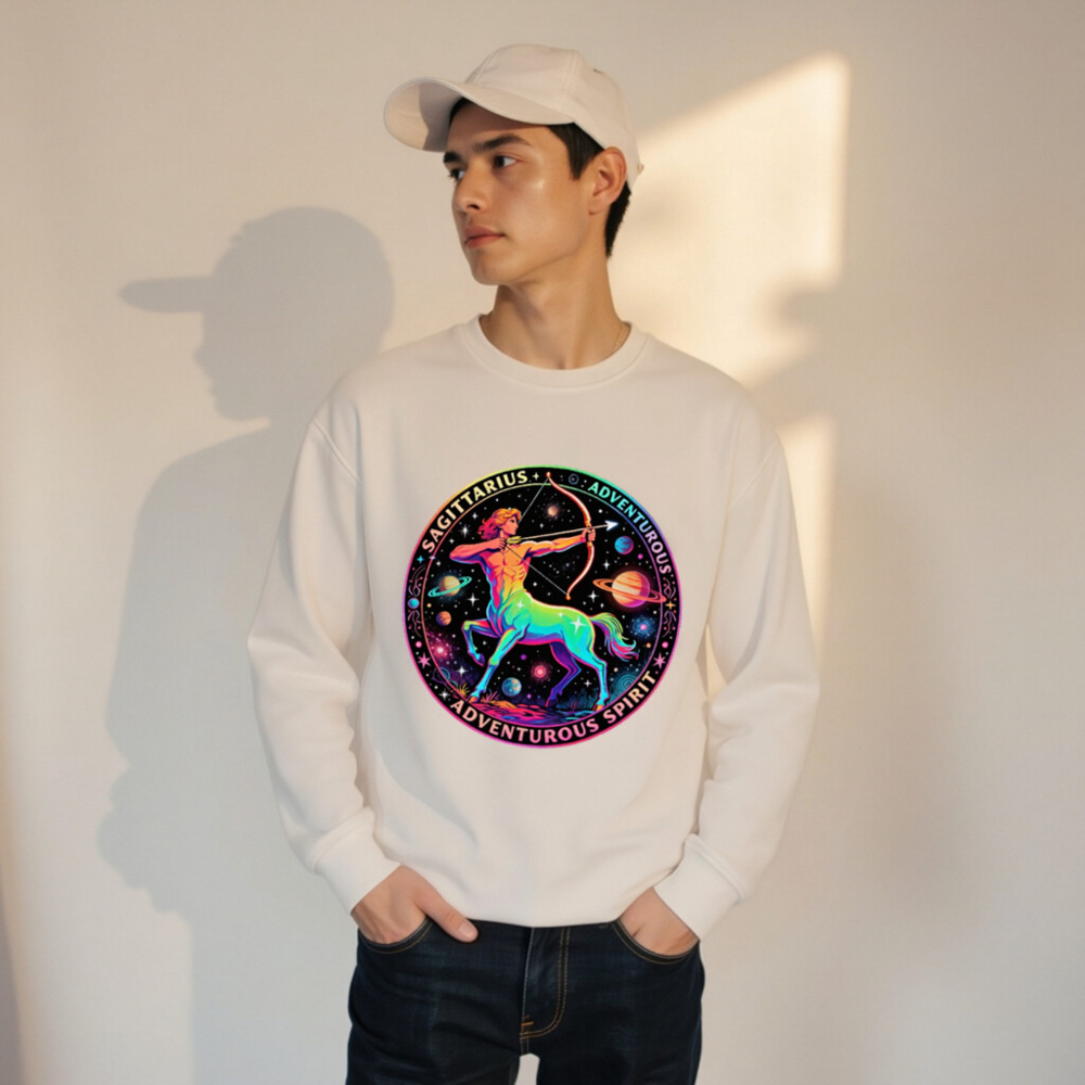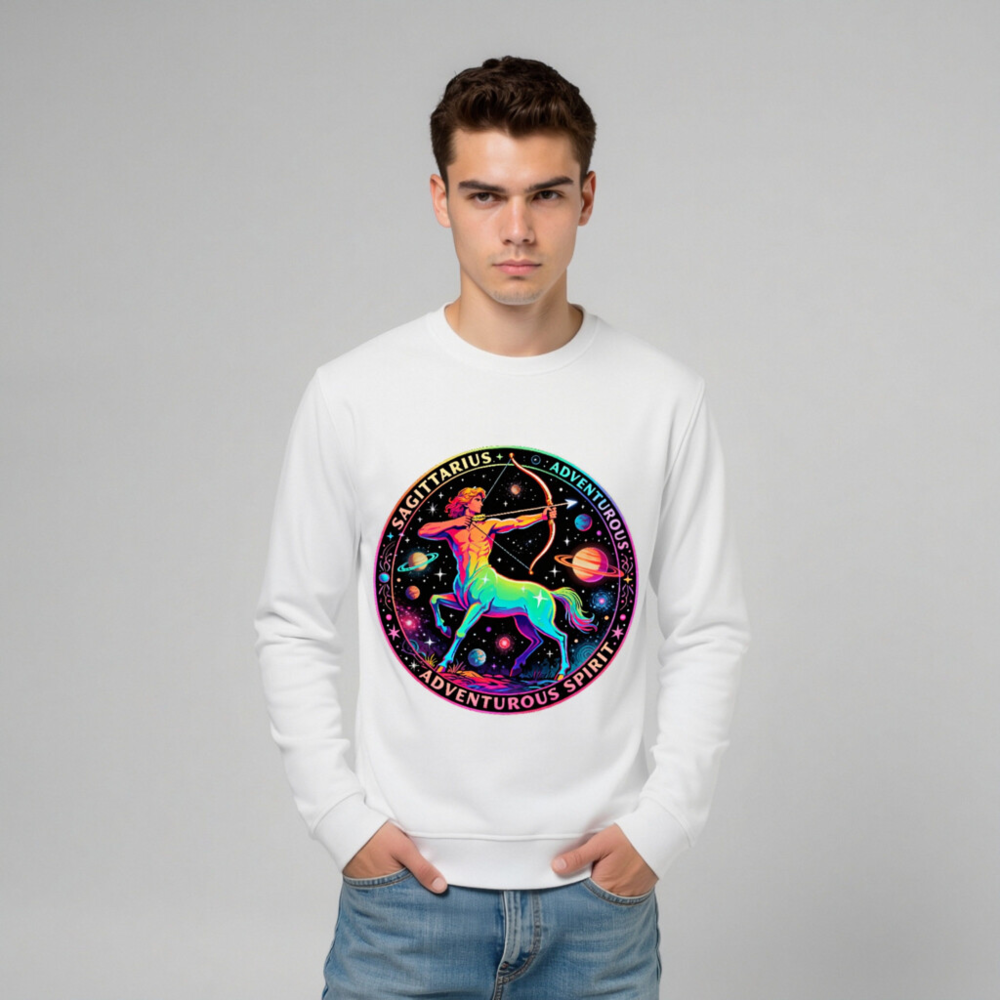 Wear the cosmic energy of Sagittarius with this unisex organic sweatshirt featuring a vibrant rainbow centaur archer against a starry galaxy backdrop. Crafted from certified organic cotton, it’s soft, sustainable, and perfect for adventurers. The bold circular design includes ‘SAGITTARIUS’ and ‘ADVENTUROUS SPIRIT’—a stylish statement piece for astrology lovers. Eco-friendly, comfortable, and ready for your next journey.