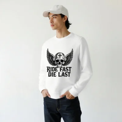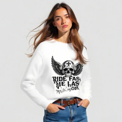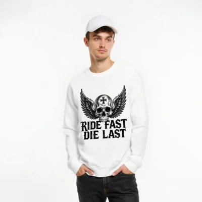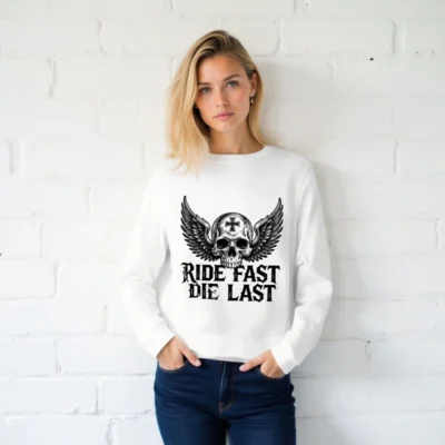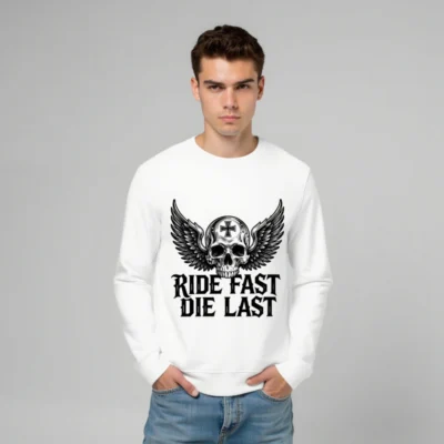 Wear the iconic ‘Ride Fast, Die Last’ slogan with this unisex organic sweatshirt—featuring a detailed winged skull with cross emblem. Made from certified organic cotton, it’s soft, sustainable, and built for comfort. Perfect for biker culture, goth, or rebellious style lovers. Eco-friendly, durable, and ready to ride.