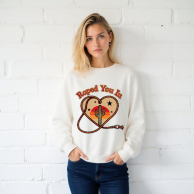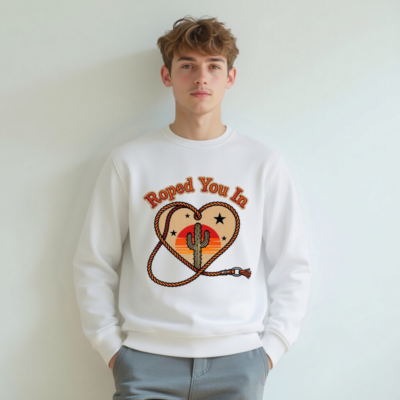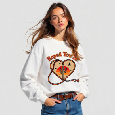 Wear the ‘Roped You In’ unisex organic sweatshirt—featuring a rustic heart-shaped rope, iconic cactus, and sunset backdrop. Made from certified organic cotton for comfort and sustainability. Soft, relaxed fit, eco-friendly, and perfect for desert lovers. Ideal for casual wear or gifting. Sustainable fashion with Western charm.