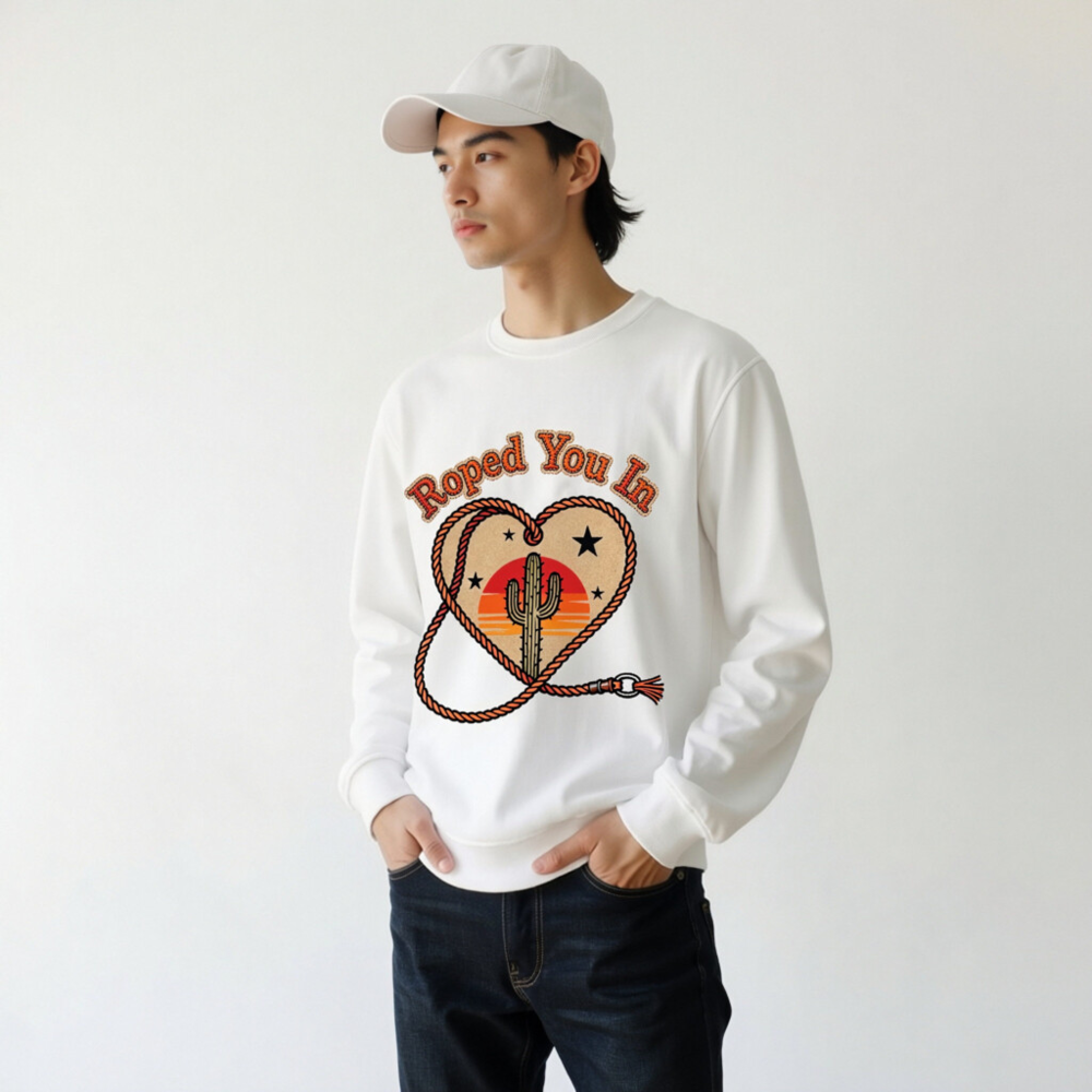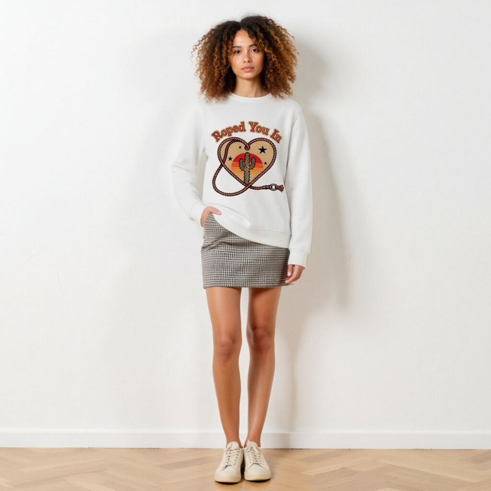 Wear the ‘Roped You In’ unisex organic sweatshirt—featuring a rustic heart-shaped rope, iconic cactus, and sunset backdrop. Made from certified organic cotton for comfort and sustainability. Soft, relaxed fit, eco-friendly, and perfect for desert lovers. Ideal for casual wear or gifting. Sustainable fashion with Western charm.