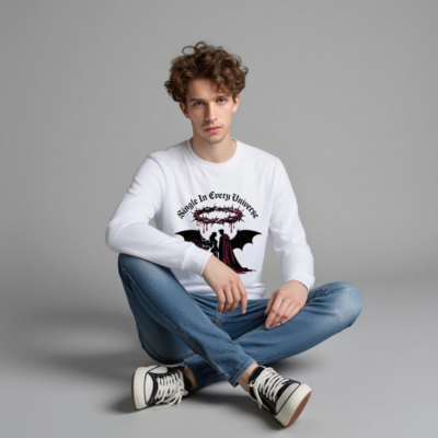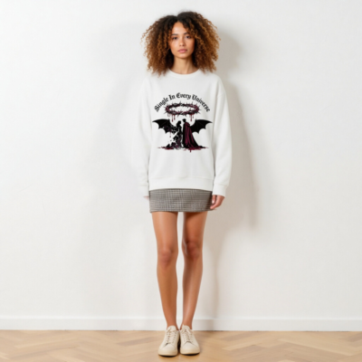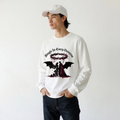 A unisex organic cotton sweatshirt featuring a striking gothic design: a vampire couple with bat wings, shattered glass effect, and a blood-dripping crown of thorns. The bold phrase ‘Single In Every Universe’ arches above—perfect for dark romance lovers. Soft, eco-friendly, and ethically made with certified organic materials. Ideal for Halloween, goth fashion, or everyday wear.