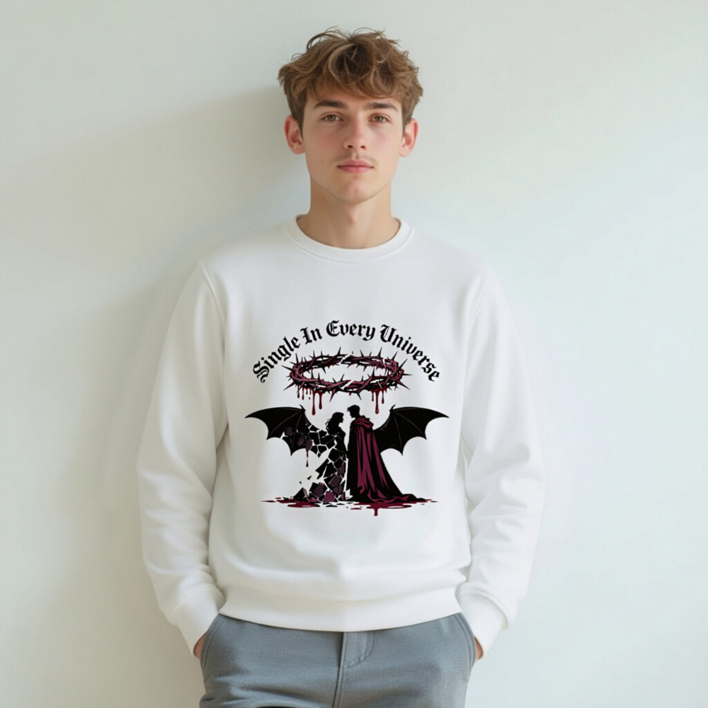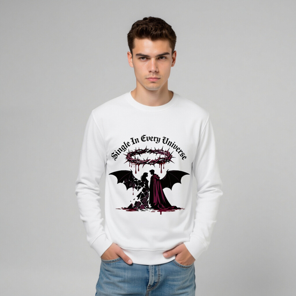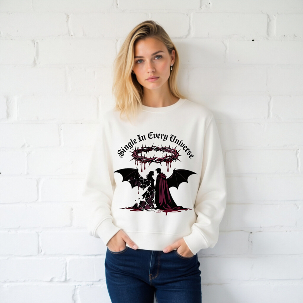 A unisex organic cotton sweatshirt featuring a striking gothic design: a vampire couple with bat wings, shattered glass effect, and a blood-dripping crown of thorns. The bold phrase ‘Single In Every Universe’ arches above—perfect for dark romance lovers. Soft, eco-friendly, and ethically made with certified organic materials. Ideal for Halloween, goth fashion, or everyday wear.