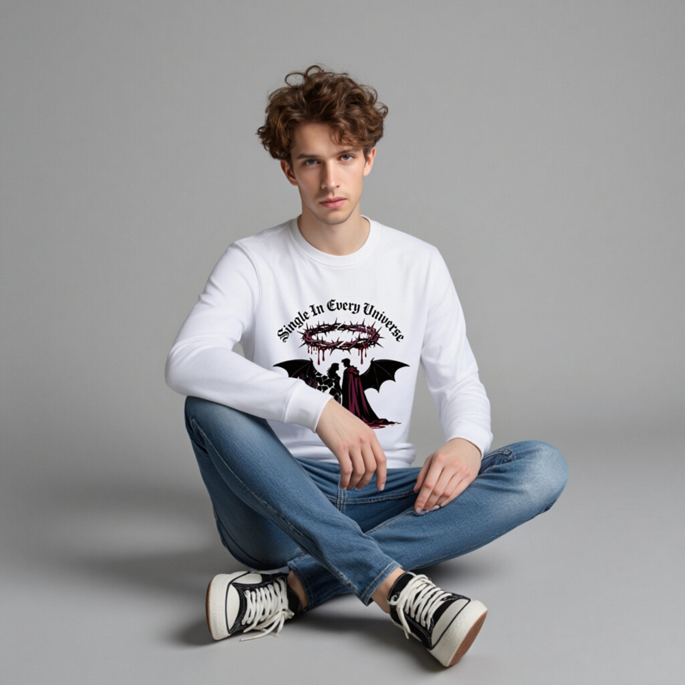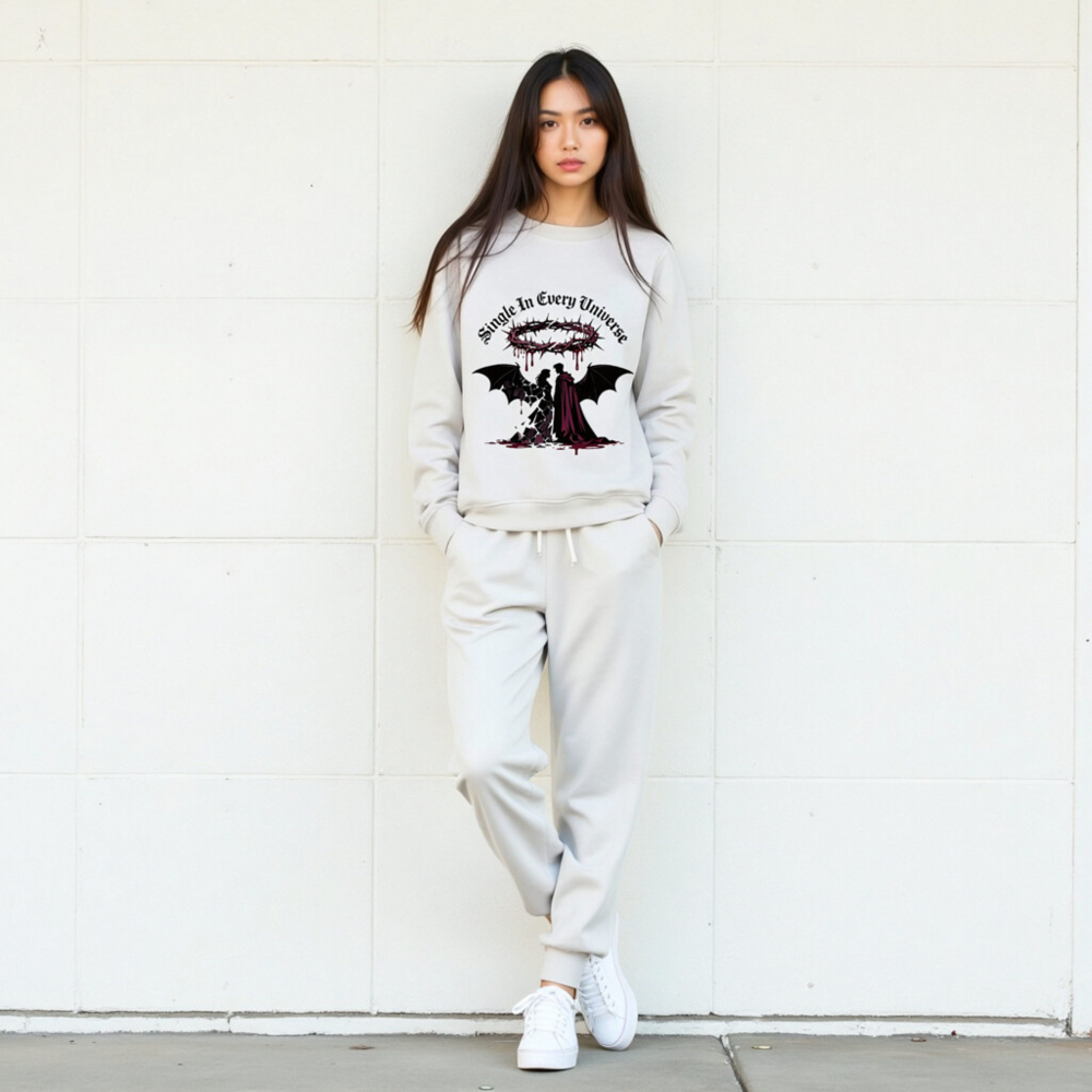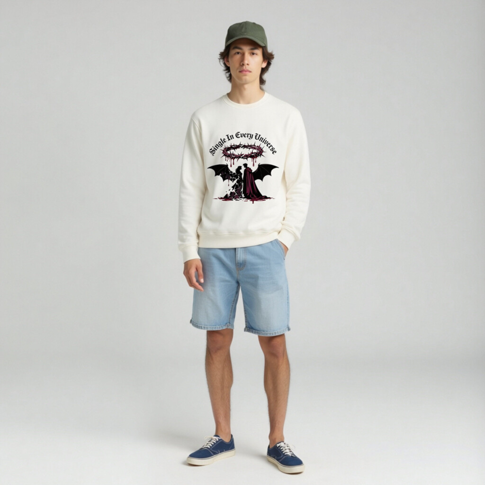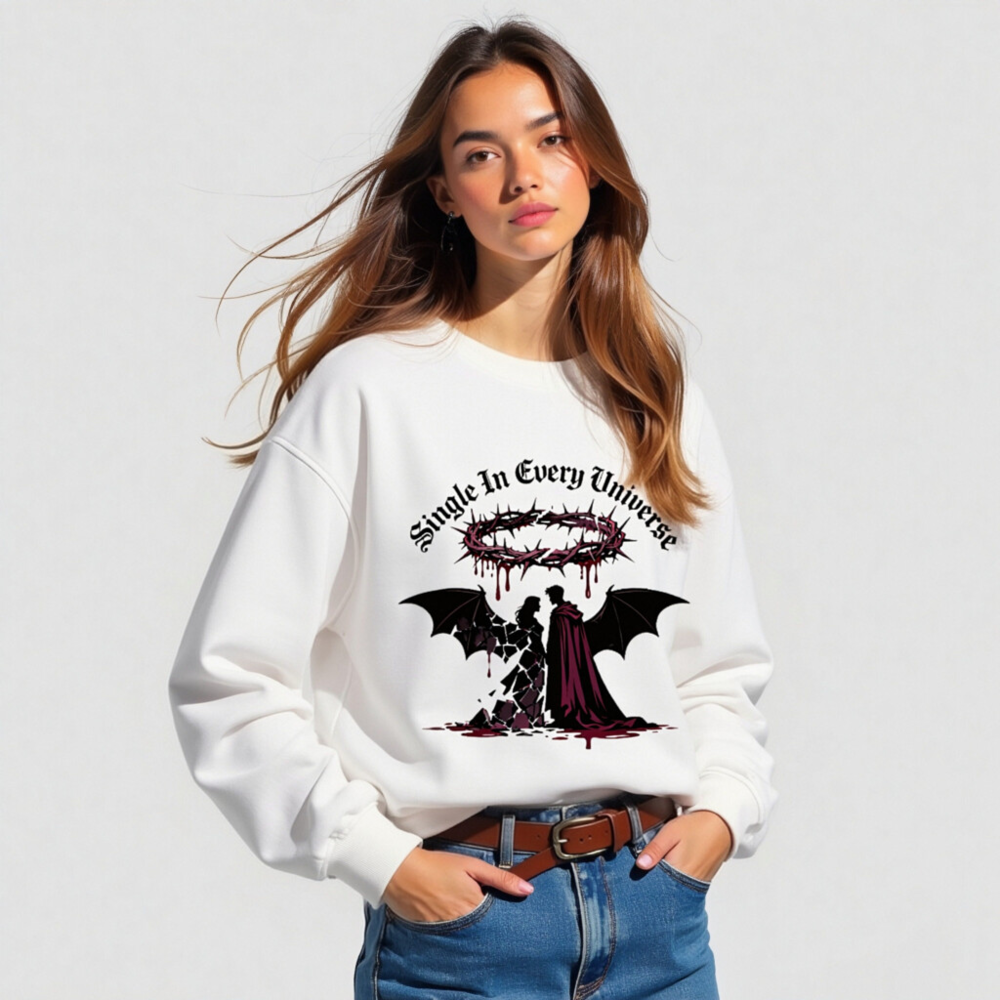 A unisex organic cotton sweatshirt featuring a striking gothic design: a vampire couple with bat wings, shattered glass effect, and a blood-dripping crown of thorns. The bold phrase ‘Single In Every Universe’ arches above—perfect for dark romance lovers. Soft, eco-friendly, and ethically made with certified organic materials. Ideal for Halloween, goth fashion, or everyday wear.