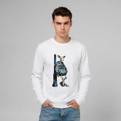 Wear sustainable style with this unisex organic sweatshirt—featuring a striking skeleton deer leaning against a lamppost, wearing a blue hoodie with ‘COLD SOUL’ text. Made from certified organic cotton (verified by standard not specified in prompt), it’s soft, eco-conscious, and designed for everyday comfort. Ideal for streetwear lovers who value ethical fashion and bold artistry.