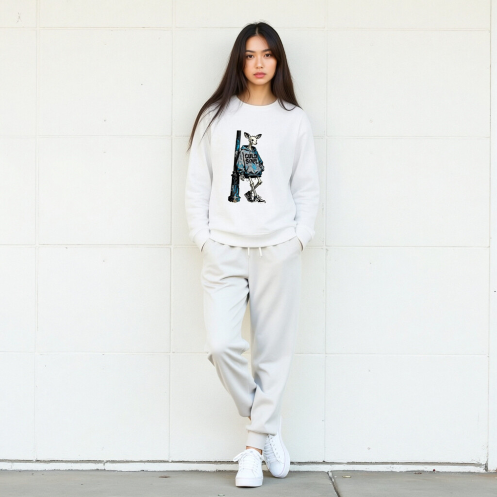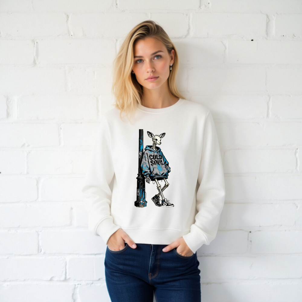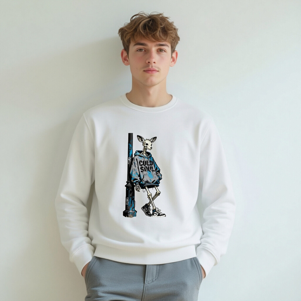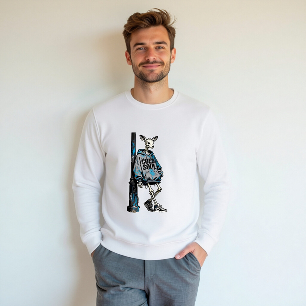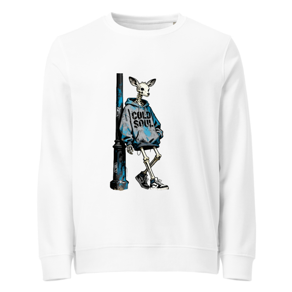 Wear sustainable style with this unisex organic sweatshirt—featuring a striking skeleton deer leaning against a lamppost, wearing a blue hoodie with ‘COLD SOUL’ text. Made from certified organic cotton (verified by standard not specified in prompt), it’s soft, eco-conscious, and designed for everyday comfort. Ideal for streetwear lovers who value ethical fashion and bold artistry.