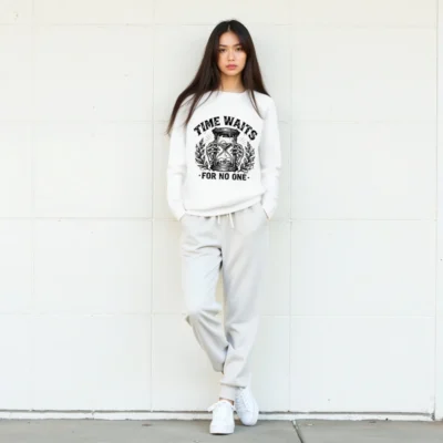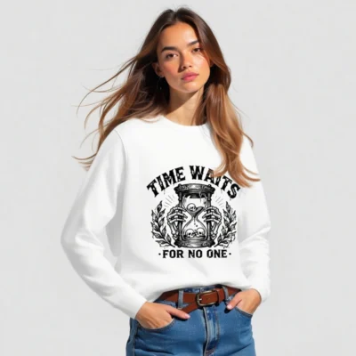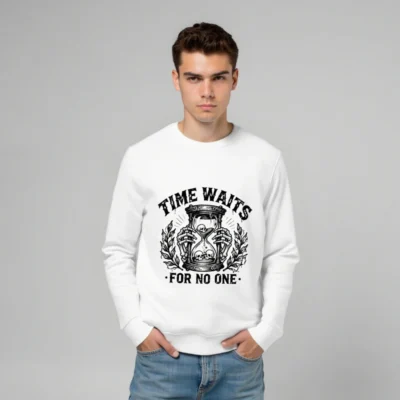 Wear timeless wisdom with this unisex organic sweatshirt featuring a striking black-and-white hourglass skull design. Made from certified organic cotton, it offers comfort and sustainability without compromising on bold style. The ‘Time Waits For No One’ motif evokes gothic elegance—ideal for fans of dark aesthetics, philosophy, or minimalist statement wear. Soft, durable, and ethically crafted for everyday wear.