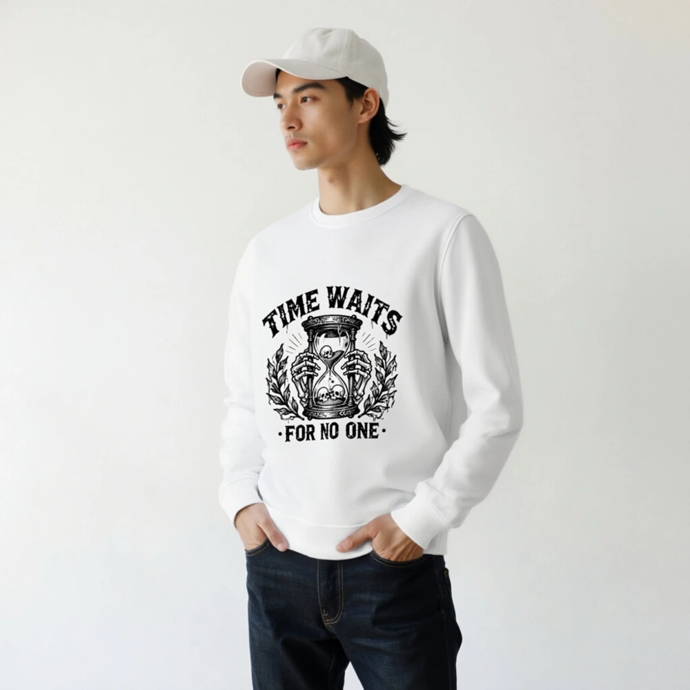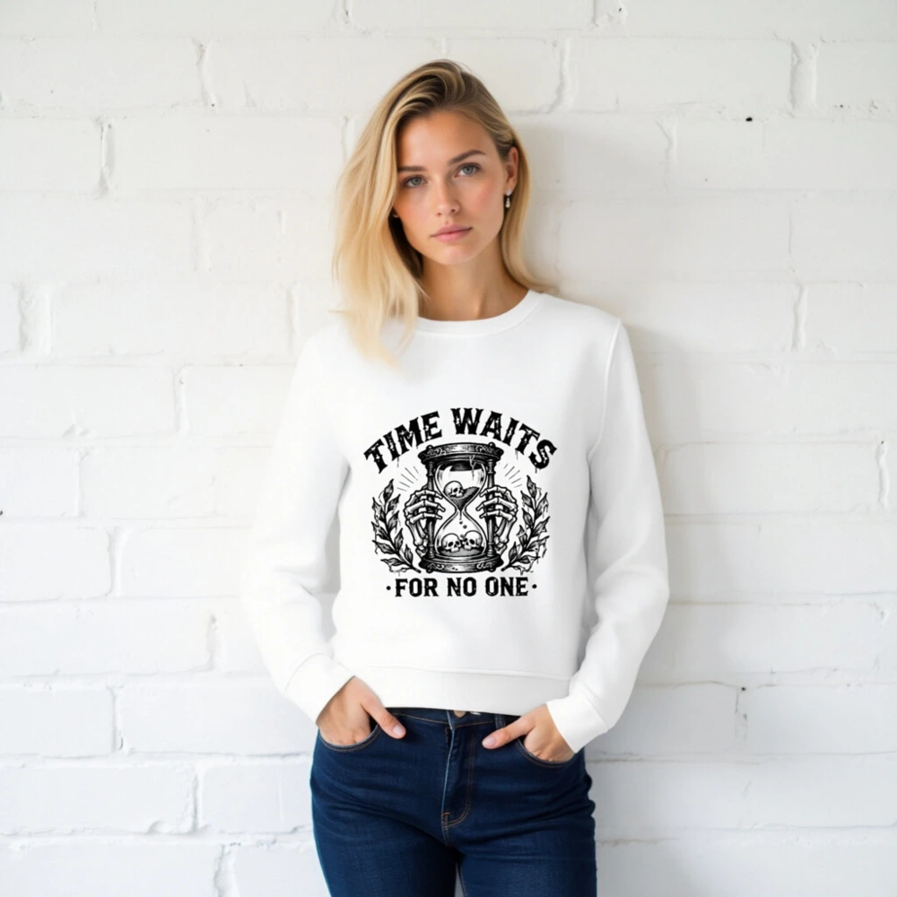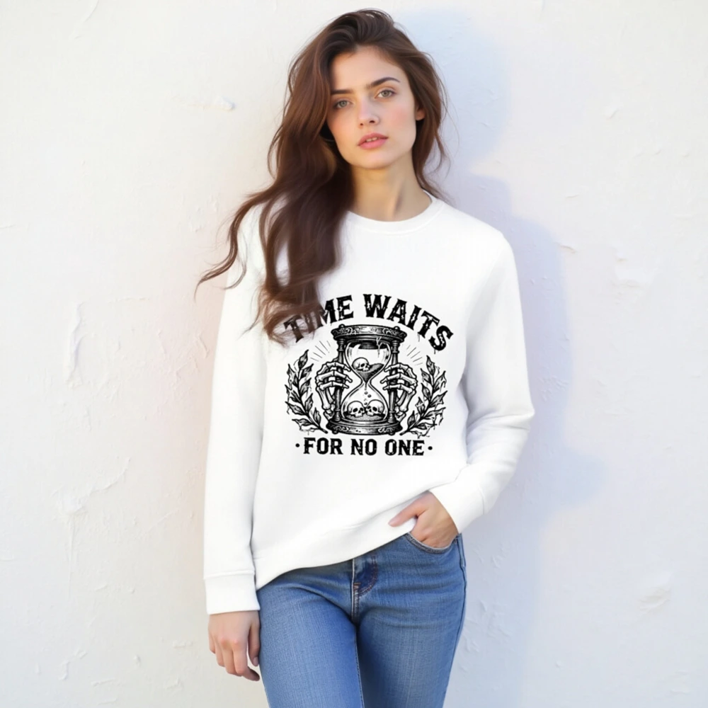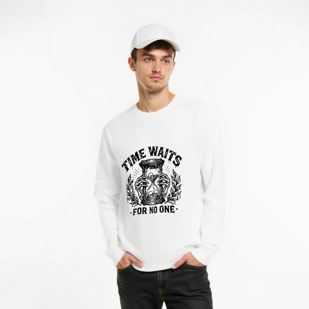 Wear timeless wisdom with this unisex organic sweatshirt featuring a striking black-and-white hourglass skull design. Made from certified organic cotton, it offers comfort and sustainability without compromising on bold style. The ‘Time Waits For No One’ motif evokes gothic elegance—ideal for fans of dark aesthetics, philosophy, or minimalist statement wear. Soft, durable, and ethically crafted for everyday wear.