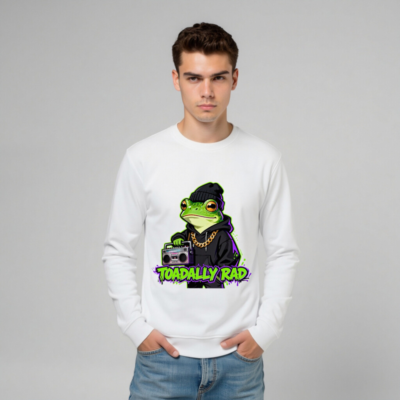 Wear the ‘Toadally Rad’ unisex organic sweatshirt — a vibrant, eco-friendly design featuring a cool green frog in hoodie, beanie, and gold chain, holding a retro boombox. Made from certified organic cotton, this sustainable piece blends streetwear style with environmental responsibility. Perfect for fans of quirky, bold fashion. Shop now for comfort, quality, and planet-friendly style.