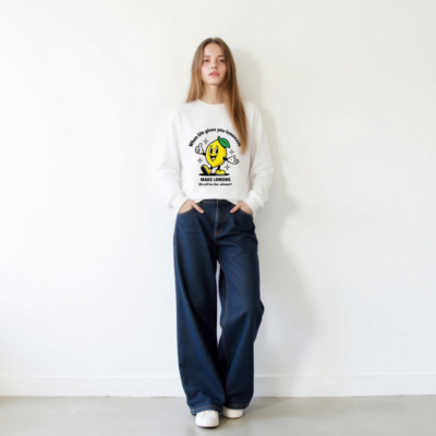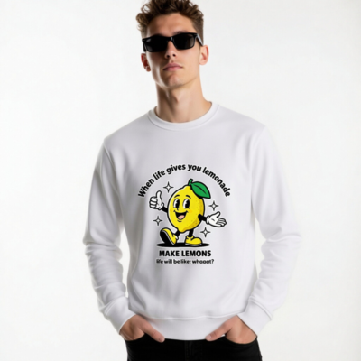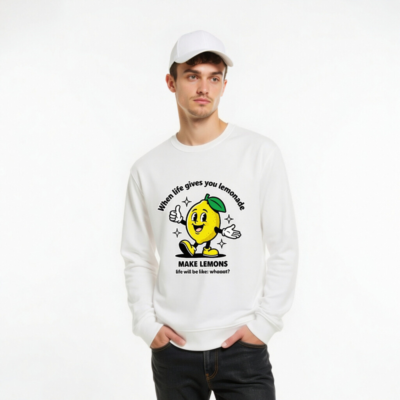 This unisex organic sweatshirt features a cheerful lemon mascot with the uplifting quote: ‘When life gives you lemonade, make lemons — life will be like: whaaat?’ Designed for comfort and sustainability, it’s made from certified organic cotton. The playful, motivational design appeals to positivity lovers and everyday optimists. Ideal for casual wear, gifting, or spreading joy. Eco-friendly, soft, and stylish — perfect for anyone who turns life’s twists into bright moments.