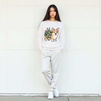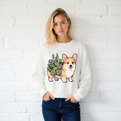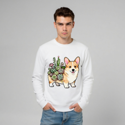 Unisex Organic Sweatshirt with Corgi & Succulent Design – Eco-Friendly, Soft & Comfortable