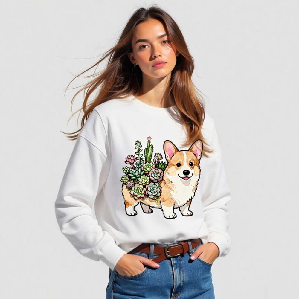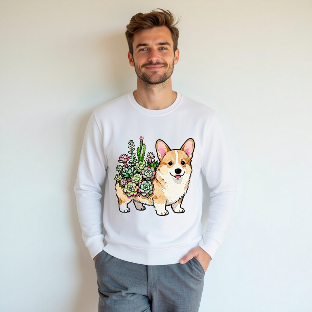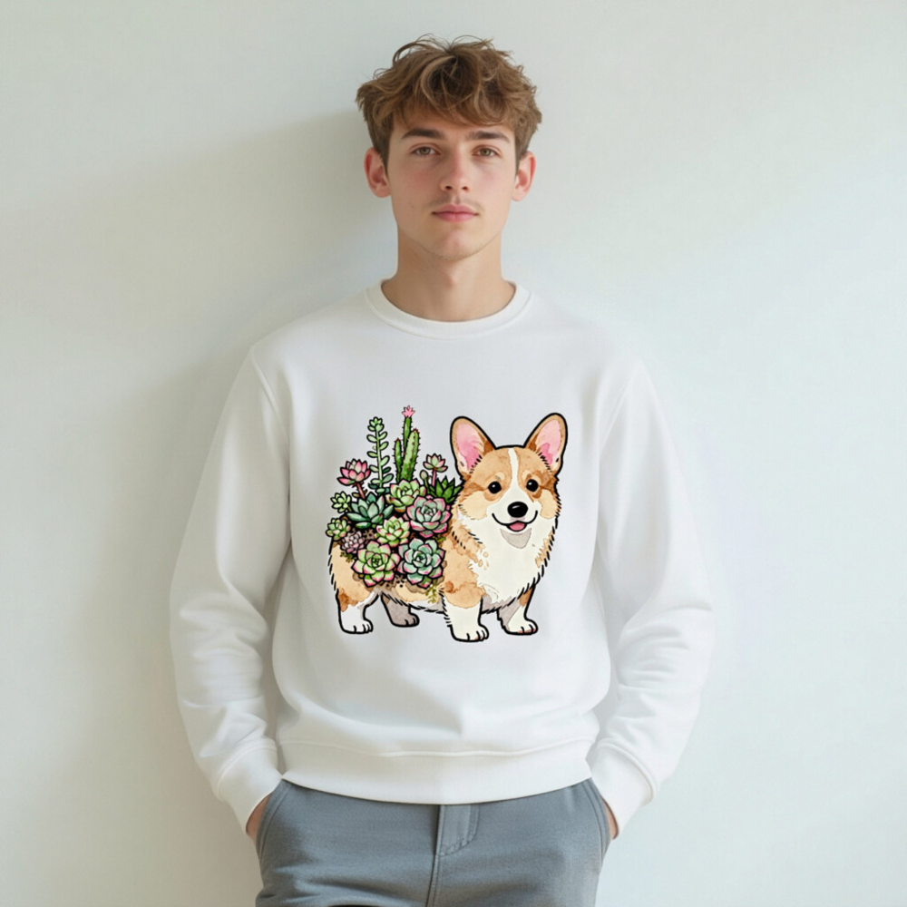 Unisex Organic Sweatshirt with Corgi & Succulent Design – Eco-Friendly, Soft & Comfortable