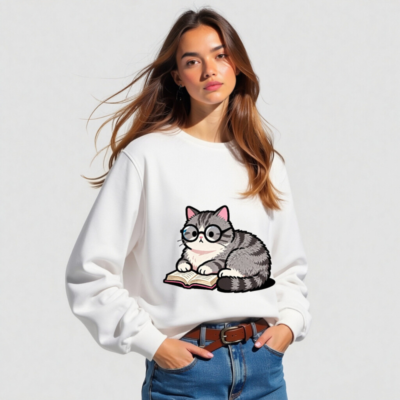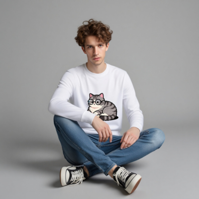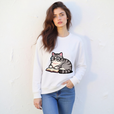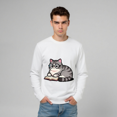 Soft, eco-friendly unisex organic sweatshirt featuring a charming gray tabby cat wearing glasses and reading a book. Made from certified organic cotton (GOTS-certified), this comfortable crewneck sweatshirt is perfect for book lovers and animal enthusiasts. Sustainable, stylish, and gentle on skin—ideal for everyday wear or as a thoughtful gift.