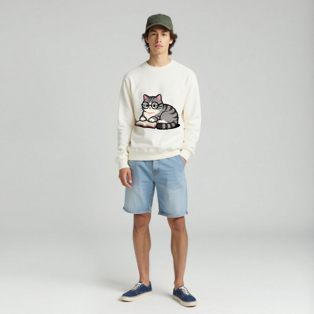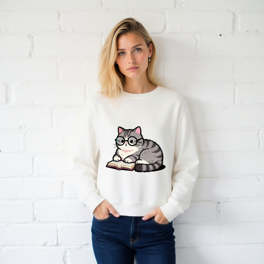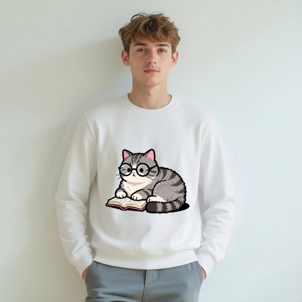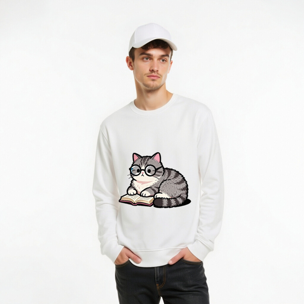Soft, eco-friendly unisex organic sweatshirt featuring a charming gray tabby cat wearing glasses and reading a book. Made from certified organic cotton (GOTS-certified), this comfortable crewneck sweatshirt is perfect for book lovers and animal enthusiasts. Sustainable, stylish, and gentle on skin—ideal for everyday wear or as a thoughtful gift.