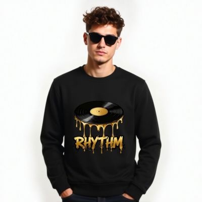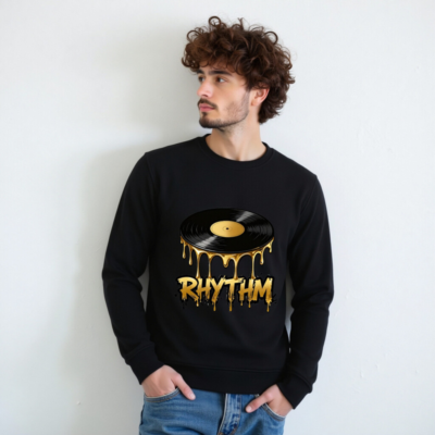 Wear the rhythm—this unisex organic sweatshirt features a striking melting vinyl record graphic with golden drips and bold ‘RHYTHM’ typography. Made from certified organic cotton, it offers comfort, sustainability, and stylish music-inspired appeal. Perfect for music lovers seeking eco-conscious fashion with a bold statement. Ideal for casual wear, concerts, or everyday style.