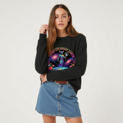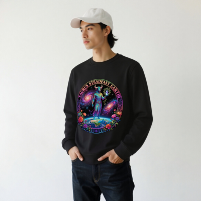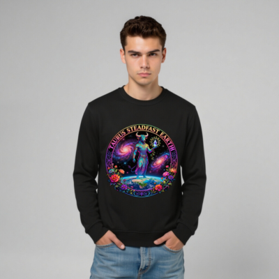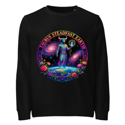 Wear cosmic strength and earthy wisdom with this unisex organic sweatshirt featuring a vibrant Taurus zodiac design—bull deity standing on Earth against galaxies, framed by floral motifs. Crafted from certified organic cotton, it’s vegan-friendly and made with fair trade principles. Perfect for astrology lovers seeking sustainable, bold fashion. Ideal for everyday comfort and meaningful self-expression.