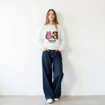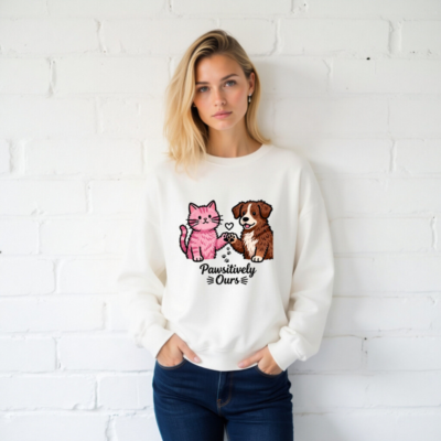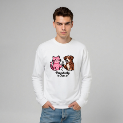 This unisex crew neck sweatshirt features a charming pink cat and brown dog holding paws with a heart and paw prints, paired with the playful phrase ‘Pawsitively Ours’. Made from soft, comfortable fabric for everyday wear. Ideal gift for pet lovers. Designed for universal fit—great for men, women, and kids. Perfect for casual outings or cozy days at home.