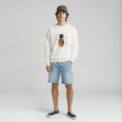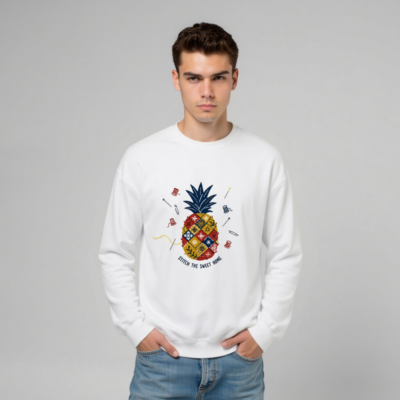 A cozy unisex crew neck sweatshirt featuring a vibrant pineapple design with patchwork patterns and sewing motifs. The playful ‘Stitch the Sweet Home’ slogan blends crafty charm with tropical flair. Soft, comfortable, and stylish—perfect for everyday wear. Ideal for sewing lovers and home decor enthusiasts. Machine washable for easy care.