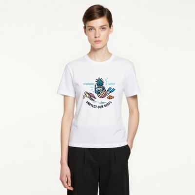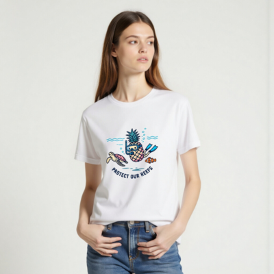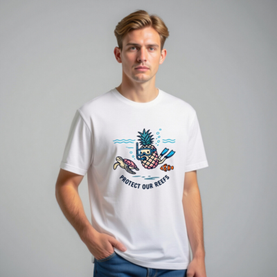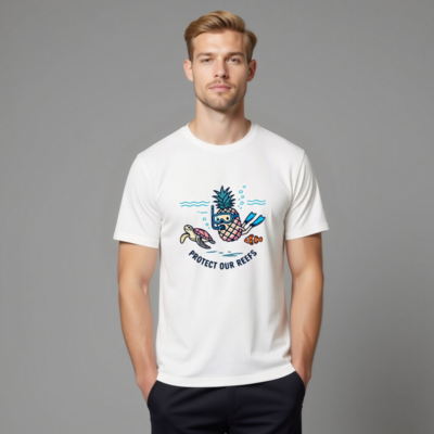 This unisex staple t-shirt features a playful pineapple snorkeler alongside a sea turtle and clownfish, promoting ocean conservation with the message ‘Protect Our Reefs.’ Made from soft, durable cotton for everyday comfort. Ideal for reef lovers and eco-conscious shoppers seeking fun, meaningful apparel. Designed for all ages and genders—versatile, sustainable, and proudly ocean-aware.