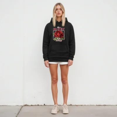 This unisex premium pullover hoodie features a striking red rose graphic with the empowering message ‘Bloom Bravely, Shine Softly’—perfect for those who embrace strength and grace. Crafted from soft, durable fabric with a classic fit, it includes a front kangaroo pocket, adjustable drawstring hood, and ribbed cuffs and hem. Ideal for casual wear, gifting, or self-expression. Machine washable and designed for all-day comfort. A meaningful, stylish choice for women and men who value bold yet gentle individuality.