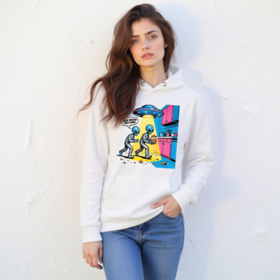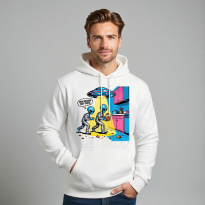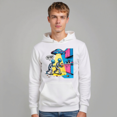 Unisex Premium Pullover Hoodie – Alien Cookie Heist Design, Funny Sci-Fi Graphic Sweatshirt