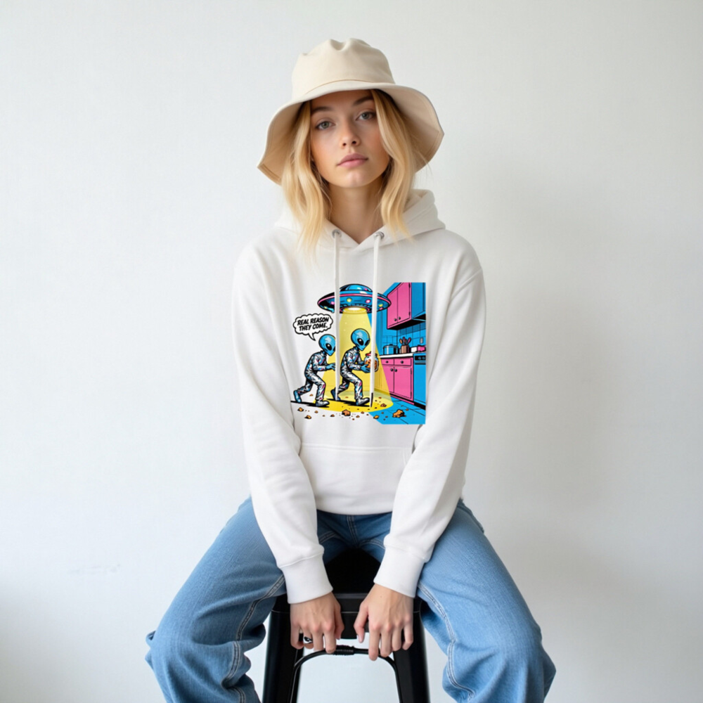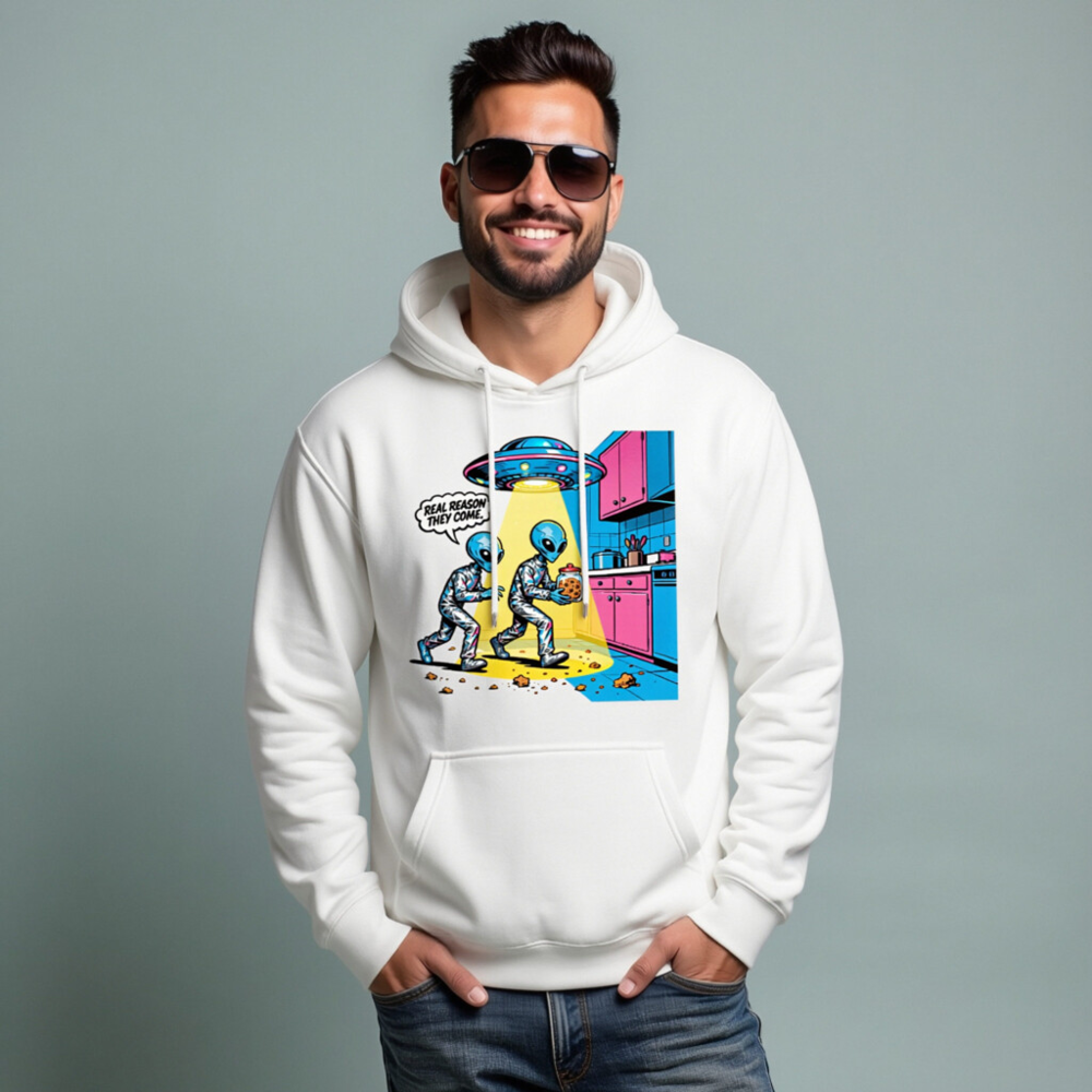 Unisex Premium Pullover Hoodie – Alien Cookie Heist Design, Funny Sci-Fi Graphic Sweatshirt