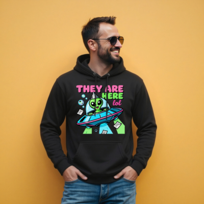 Wear the fun with this unisex premium pullover hoodie featuring a vibrant alien in a UFO wearing a party hat, surrounded by bubbles and papers — perfect for sci-fi fans and humor lovers. Soft, comfortable fit, versatile for casual wear. Ideal gift for birthdays, holidays, or any occasion where you want to say ‘They Are Here lol’ with style. Machine washable, durable print.