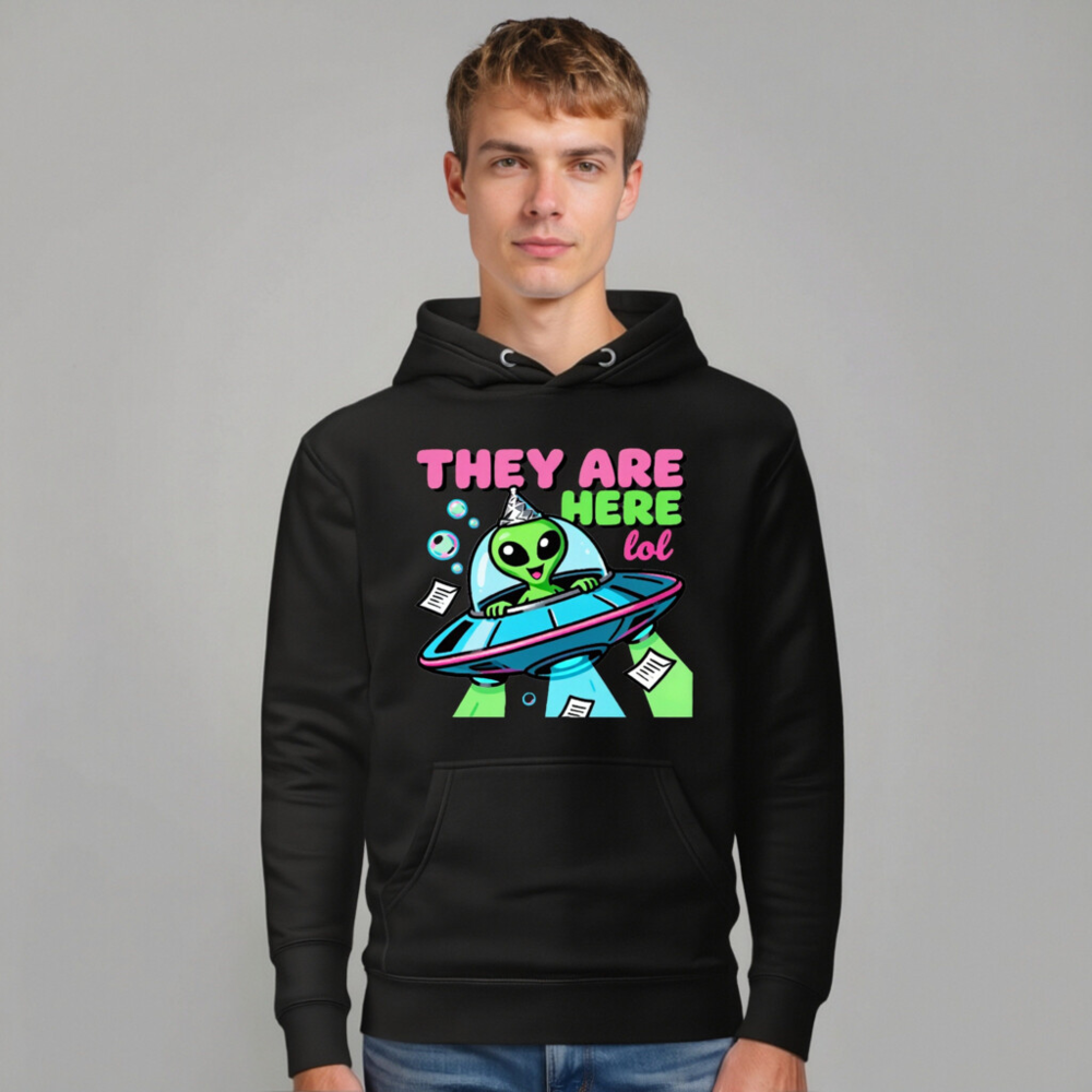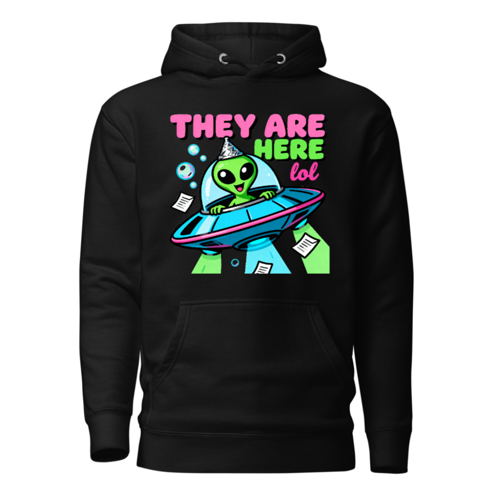 Unisex Premium Pullover Hoodie – Alien UFO Party Design ‘They Are Here lol’