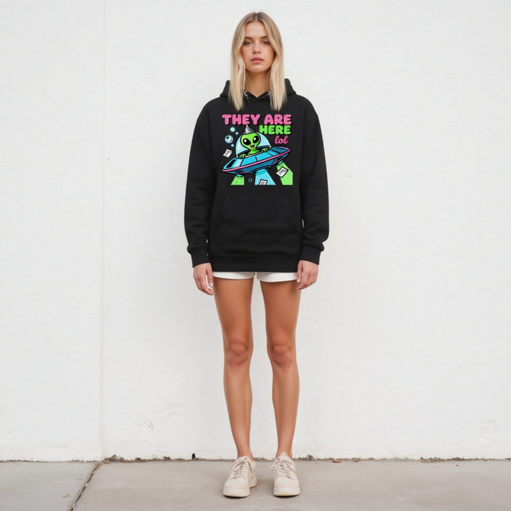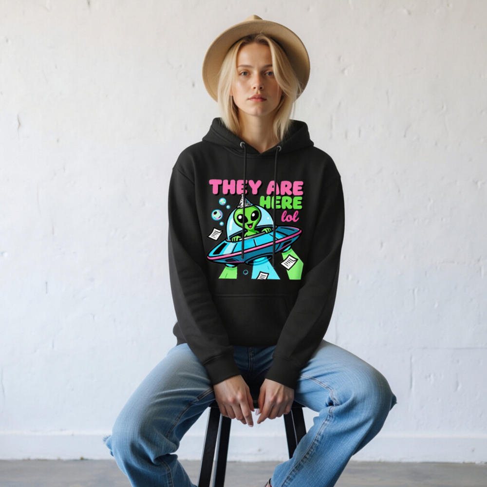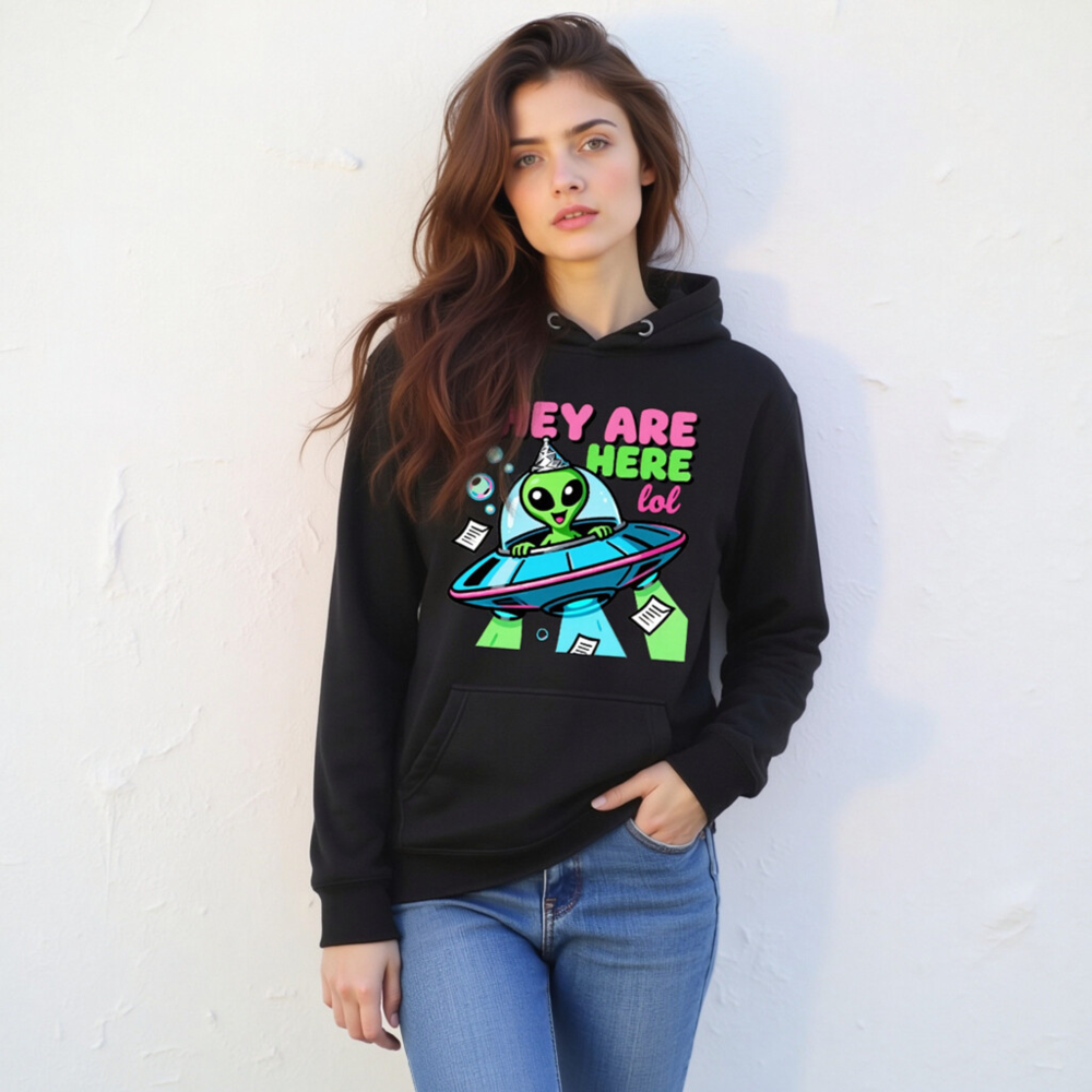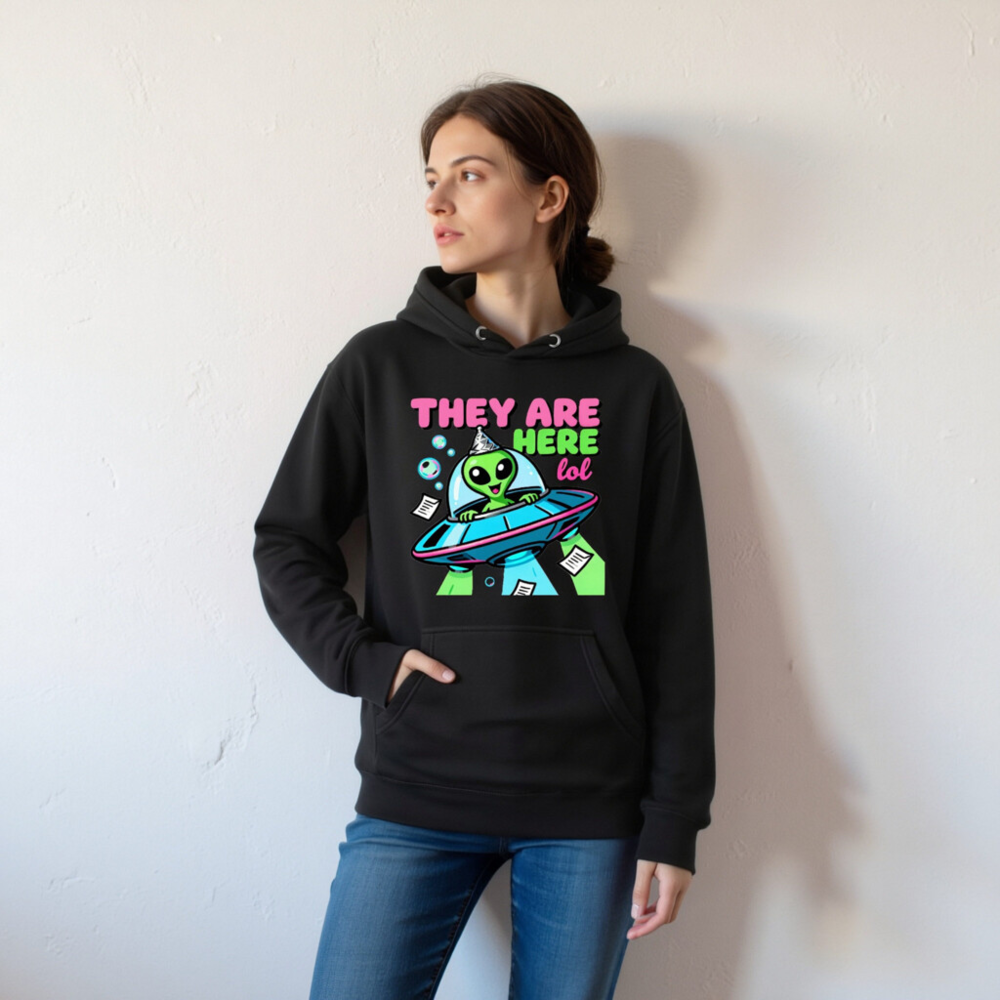 Wear the fun with this unisex premium pullover hoodie featuring a vibrant alien in a UFO wearing a party hat, surrounded by bubbles and papers — perfect for sci-fi fans and humor lovers. Soft, comfortable fit, versatile for casual wear. Ideal gift for birthdays, holidays, or any occasion where you want to say ‘They Are Here lol’ with style. Machine washable, durable print.