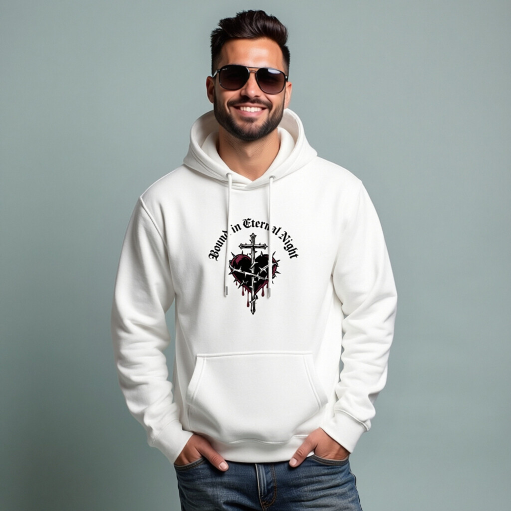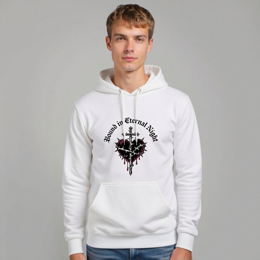 Showcase the ‘Bound in Eternal Night’ unisex premium pullover hoodie — a bold, gothic-inspired design featuring a thorn-wrapped heart pierced by a cross with blood drips. Made for comfort and style, this high-quality hoodie fits all genders. Ideal for fans of dark aesthetics, alternative fashion, or symbolic apparel. Durable fabric, soft fleece lining, and classic drawstring hood. Wear your devotion—elegantly, powerfully.