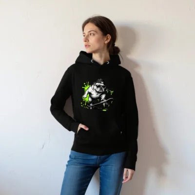Show off your street style with this unisex premium pullover hoodie featuring a bold, black-and-white bulldog skateboarding graphic accented with vibrant neon green splashes. Designed for comfort and everyday wear, it offers a relaxed fit, front pouch pocket, and durable construction. Perfect for casual outings or as a statement piece for skate culture fans. Ideal for all genders—sized for universal appeal.
