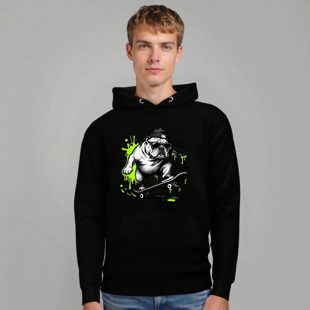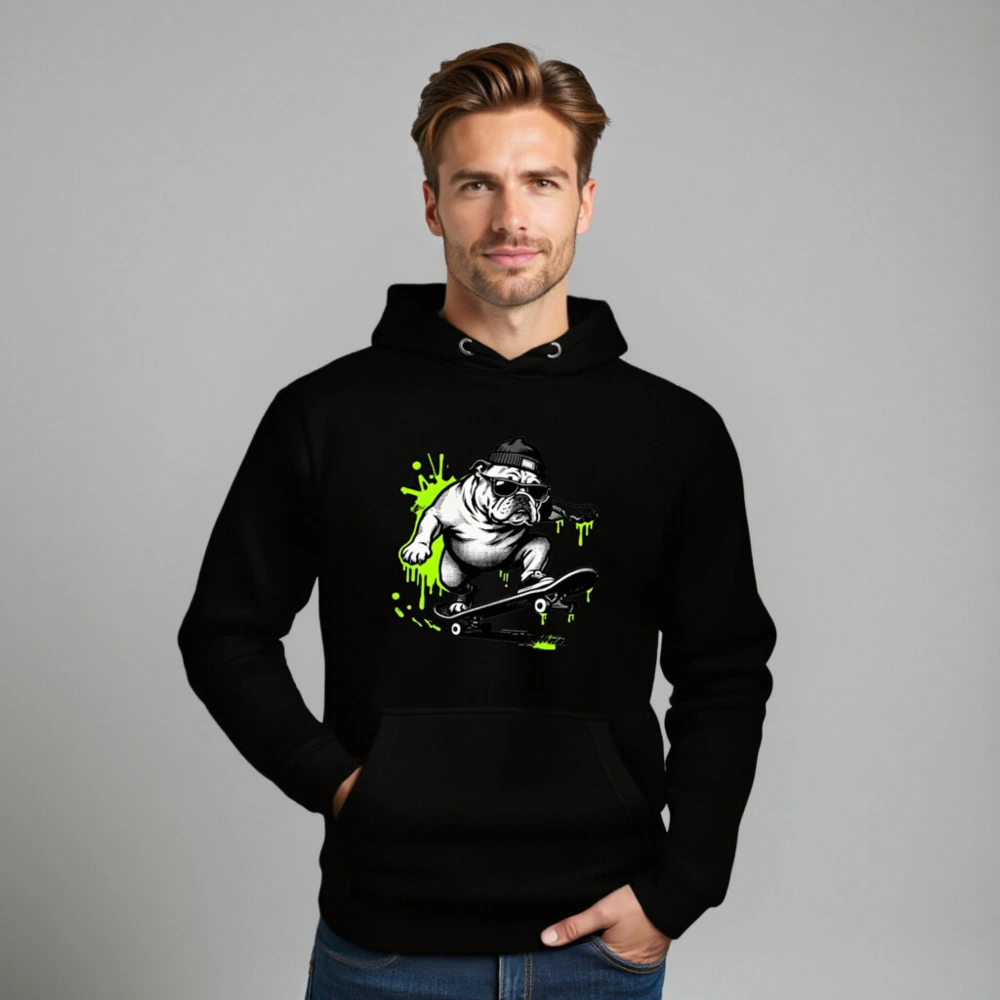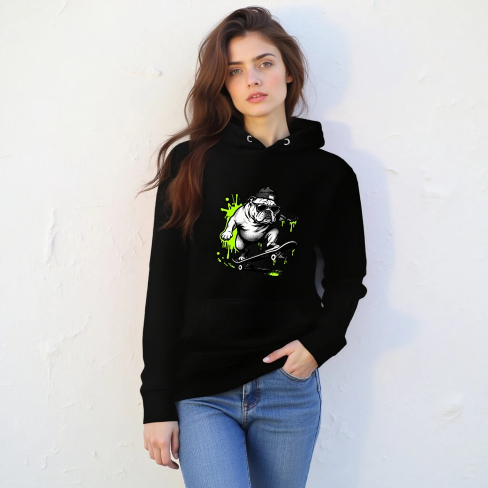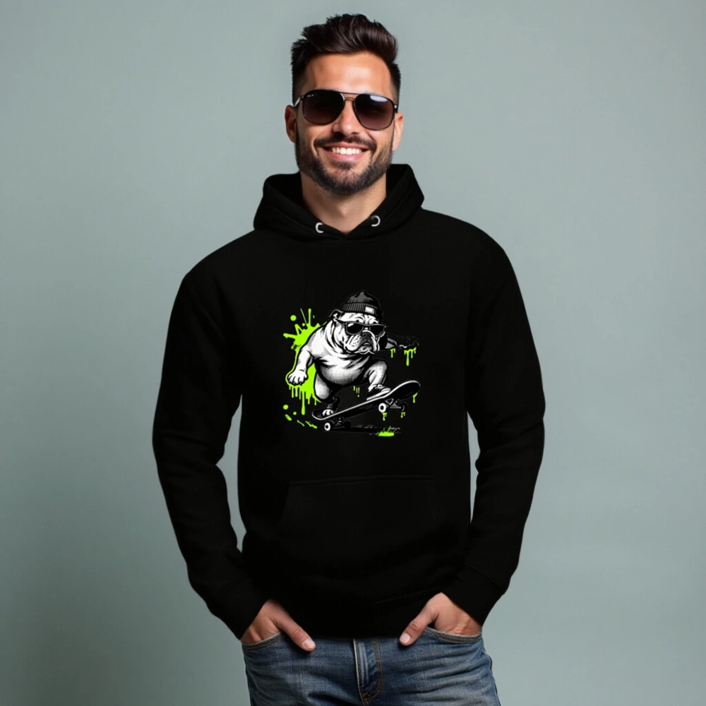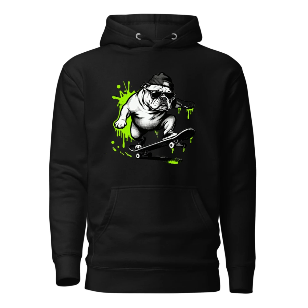 Show off your street style with this unisex premium pullover hoodie featuring a bold, black-and-white bulldog skateboarding graphic accented with vibrant neon green splashes. Designed for comfort and everyday wear, it offers a relaxed fit, front pouch pocket, and durable construction. Perfect for casual outings or as a statement piece for skate culture fans. Ideal for all genders—sized for universal appeal.
