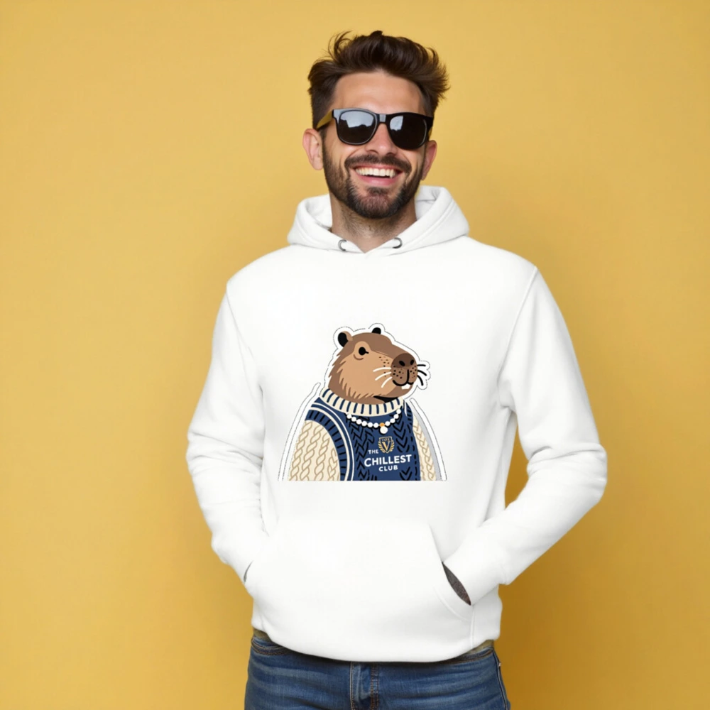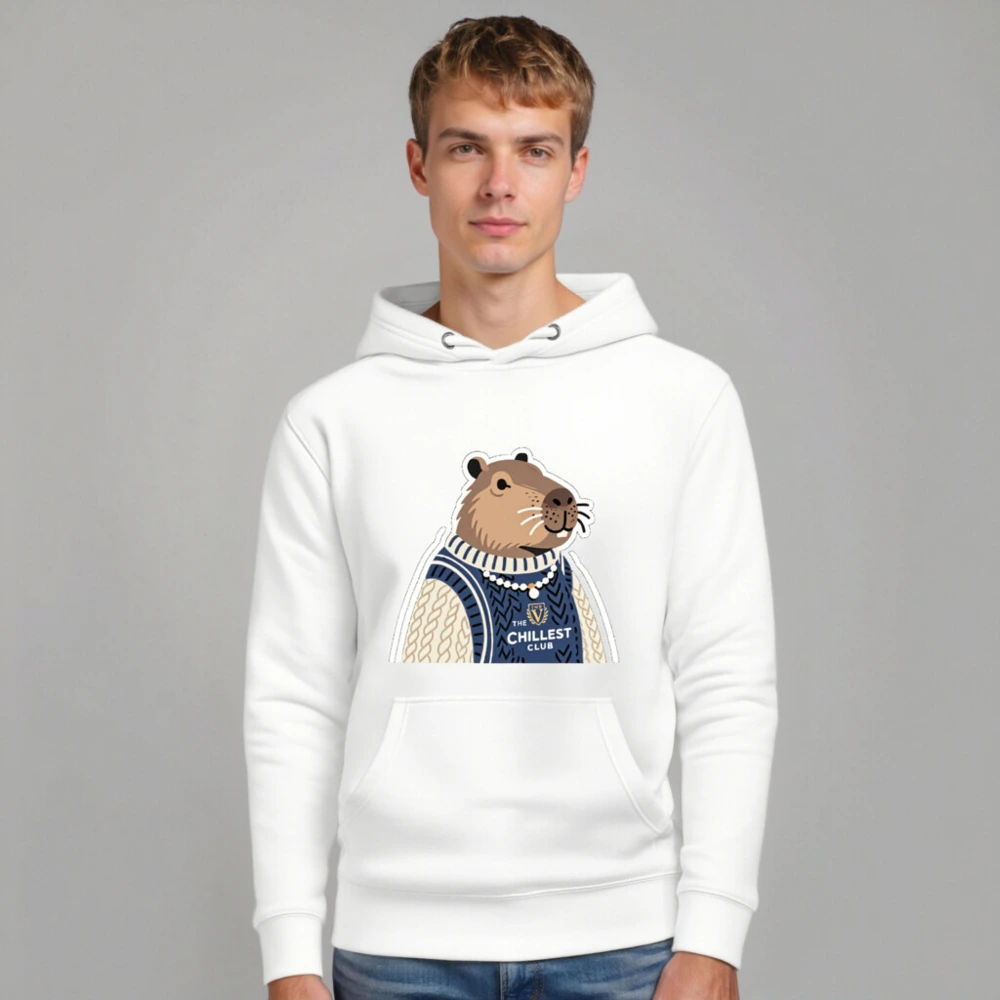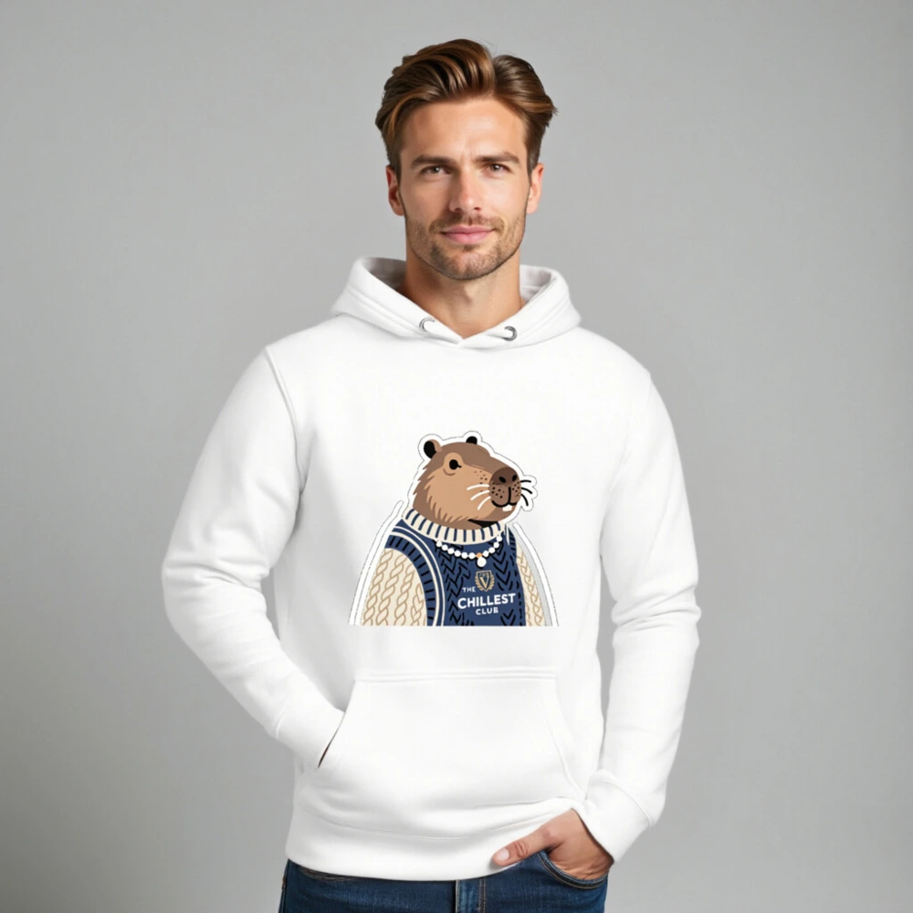 This unisex premium pullover hoodie features a charming capybara in a cozy navy and cream cable-knit sweater, proudly displaying ‘The Chillest Club’ logo. Crafted for comfort with soft cotton blend fabric, it’s perfect for casual wear or as a fun gift. The playful design combines relaxed style with a humorous, laid-back vibe—ideal for anyone who embraces chill energy. Machine washable, durable, and true to size.