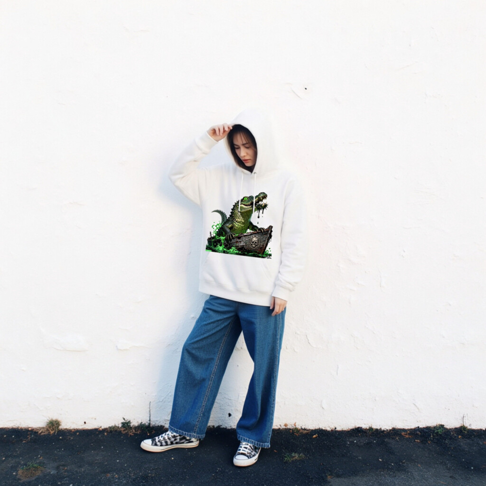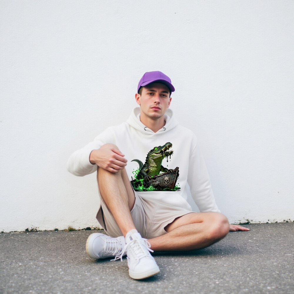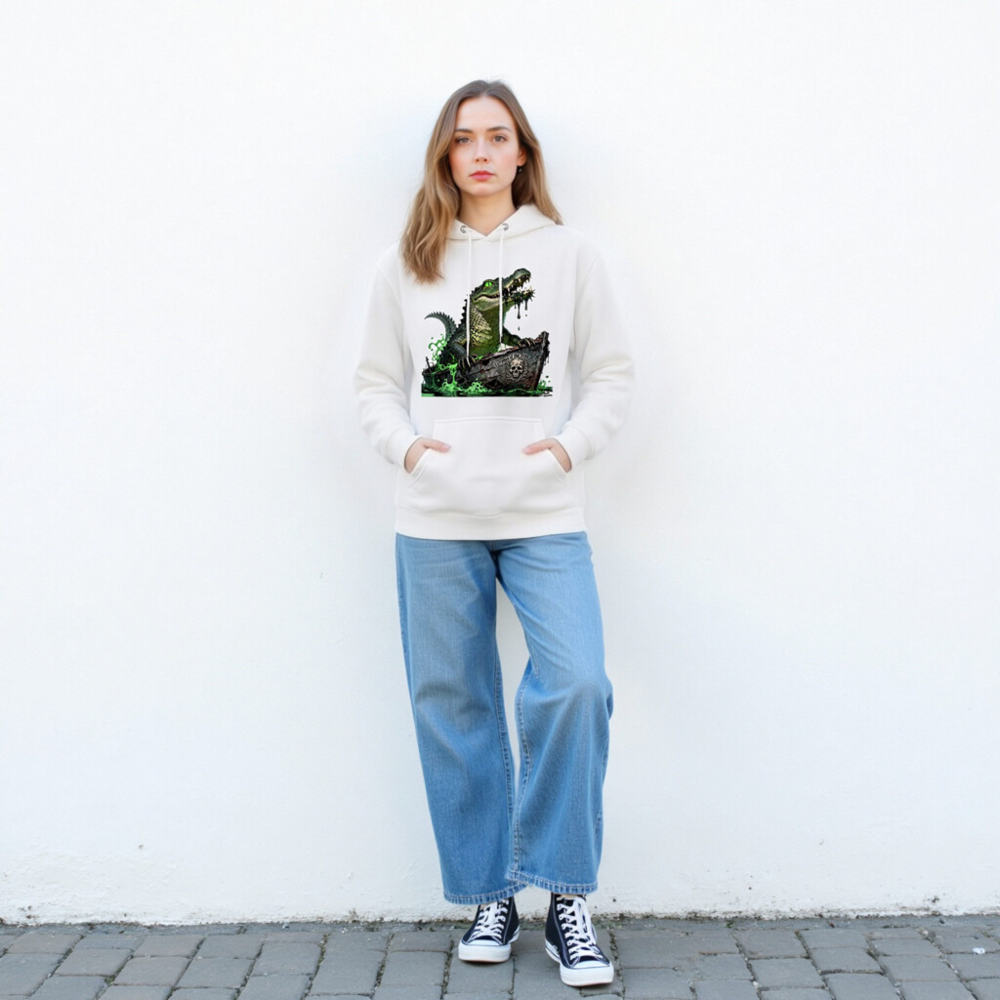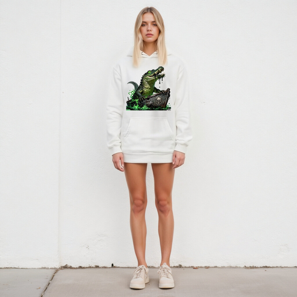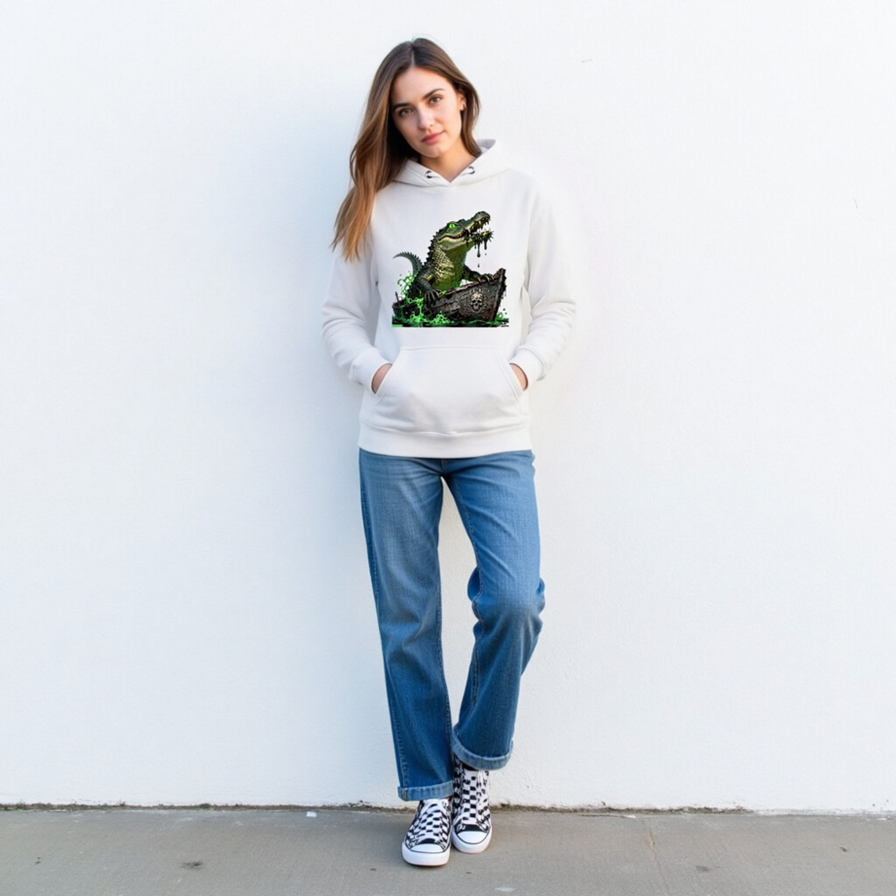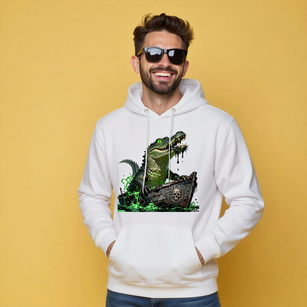 A premium unisex pullover hoodie featuring a striking graphic of a green-eyed crocodile emerging from a weathered boat marked ‘Ferryman of the Swamps’ and a skull emblem. The design includes vibrant green slime effects for a bold, fantasy-inspired look. Made with soft, durable fabric for all-day comfort. Ideal for fans of mythical creatures and unique streetwear. Perfect for casual wear or as a statement piece.