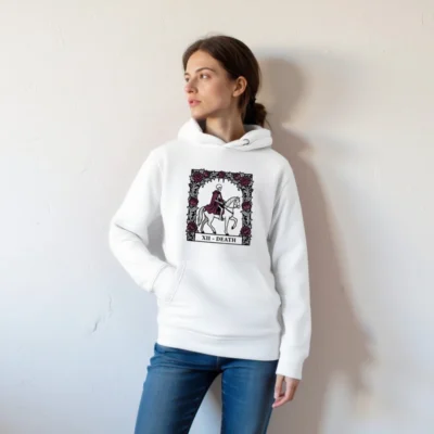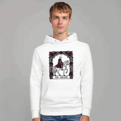 This unisex premium pullover hoodie features a striking ‘Death’ tarot card illustration—skeleton rider on white horse, framed by deep red roses and ornate black vines. Printed with high-quality ink for durability. Soft, comfortable cotton blend fabric. Designed for gothic, occult, or mystical aesthetics. Fits true to size; ideal for everyday wear or themed events.