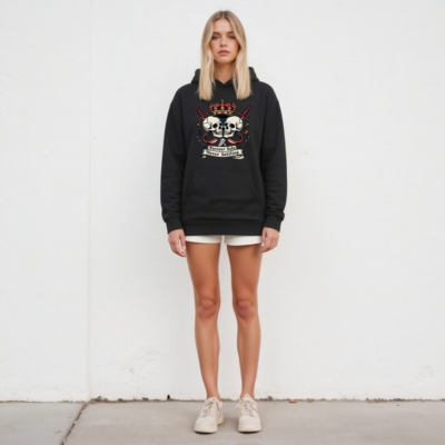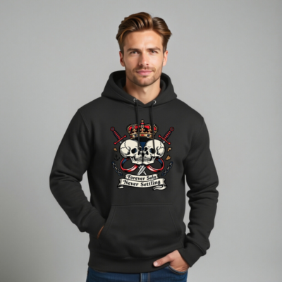 Wear bold defiance with this unisex premium pullover hoodie featuring a striking double-skull, crown, and crossed swords graphic. The ‘Forever Solo Never Settling’ banner adds rebellious flair—perfect for independent spirits. Soft, durable fabric ensures comfort all day. Designed for everyday wear, it’s a statement piece that aligns with your fearless mindset. Ideal for fans of edgy, meaningful apparel.