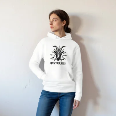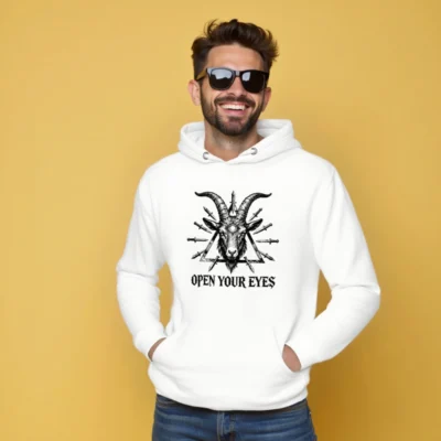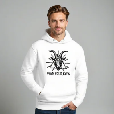 Wear the bold ‘Open Your Eyes’ unisex premium pullover hoodie featuring a striking black-and-white goat head with third eye and daggers within a triangle. Made for comfort and style—soft cotton blend, relaxed fit, durable print. Ideal for alternative fashion lovers seeking symbolic, high-impact streetwear. Perfect gift for mystic, occult, or counterculture enthusiasts.