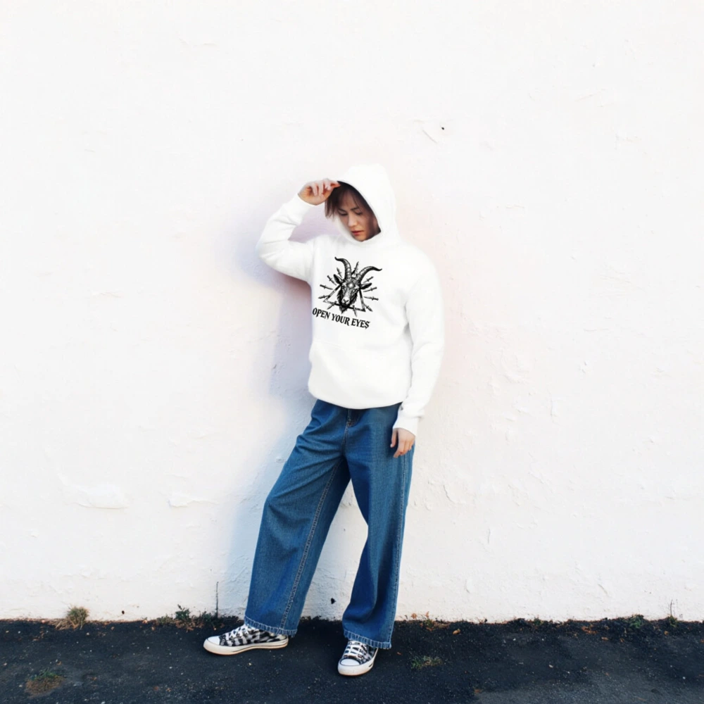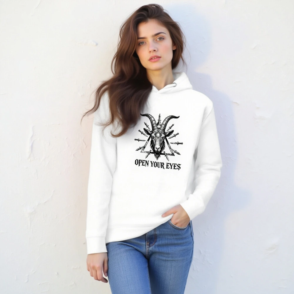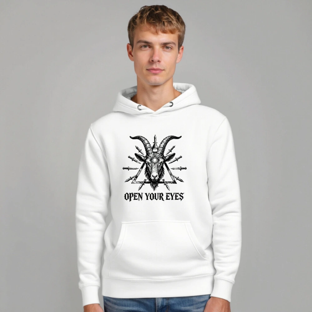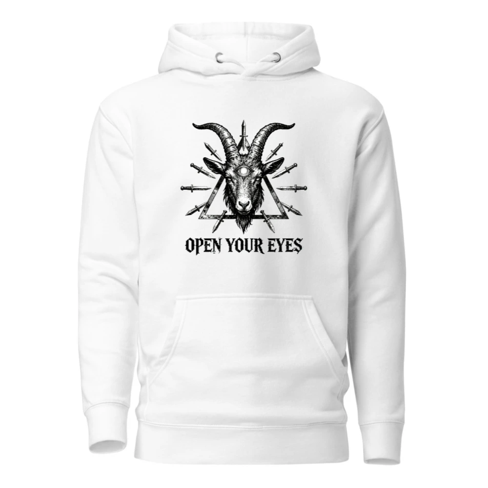 Wear the bold ‘Open Your Eyes’ unisex premium pullover hoodie featuring a striking black-and-white goat head with third eye and daggers within a triangle. Made for comfort and style—soft cotton blend, relaxed fit, durable print. Ideal for alternative fashion lovers seeking symbolic, high-impact streetwear. Perfect gift for mystic, occult, or counterculture enthusiasts.