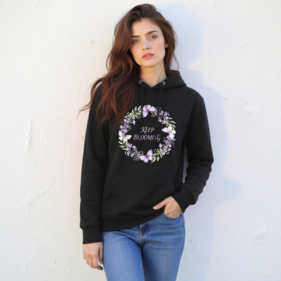 Elevate your everyday style with this unisex premium pullover hoodie, featuring a delicate purple floral wreath and butterfly motif centered around the uplifting ‘Keep Blooming’ message. Crafted for comfort and versatility, it suits all genders and occasions—ideal for casual wear, self-care moments, or gifting. Soft, durable fabric ensures lasting quality. Designed to inspire resilience and growth, this hoodie turns daily routines into gentle affirmations.