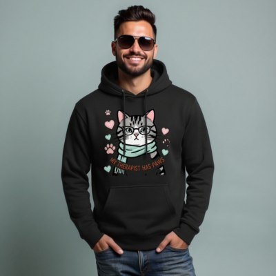Adorable unisex premium pullover hoodie featuring a stylish tabby cat with glasses and a scarf, surrounded by paw prints and hearts. The playful design includes the witty phrase ‘My Therapist Has Paws’—perfect for cat lovers seeking comfort and humor. Soft, comfortable fit with front pocket and drawstring hood. Ideal gift for animal enthusiasts.