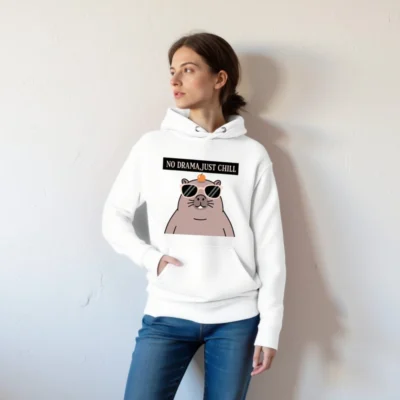 Chill in style with this unisex premium pullover hoodie featuring a fun capybara wearing sunglasses and an orange on its head. The bold ‘NO DRAMA, JUST CHILL’ slogan delivers a relaxed vibe. Made for comfort with soft fabric and classic hooded design. Perfect for casual wear, everyday chill or gifting. Available in all sizes for men, women & kids.