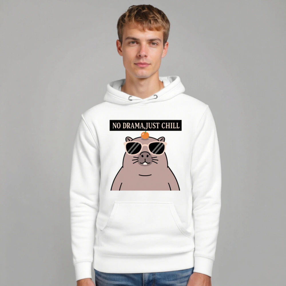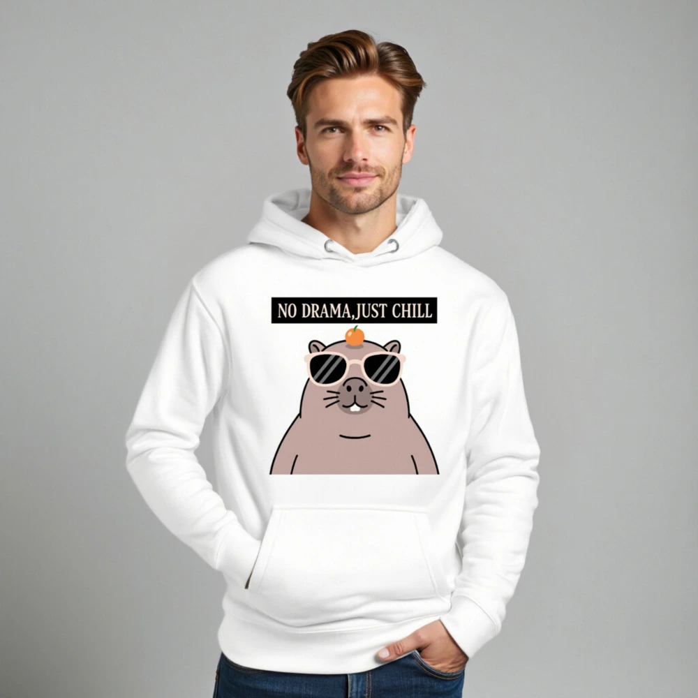 Chill in style with this unisex premium pullover hoodie featuring a fun capybara wearing sunglasses and an orange on its head. The bold ‘NO DRAMA, JUST CHILL’ slogan delivers a relaxed vibe. Made for comfort with soft fabric and classic hooded design. Perfect for casual wear, everyday chill or gifting. Available in all sizes for men, women & kids.