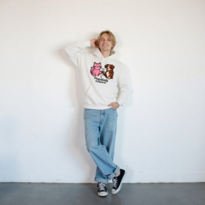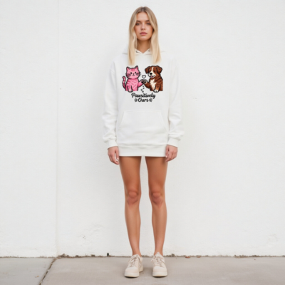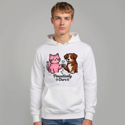 Wear your love for pets with this unisex premium pullover hoodie featuring a charming pink cat and brown dog holding paws, with a heart and paw prints. Soft, comfortable, and stylish—perfect for animal lovers. The ‘Pawsitively Ours’ design celebrates the bond between cats, dogs, and their humans. Ideal for everyday wear or gifting.