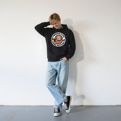 Wear your chill with this unisex premium pullover hoodie featuring a cute sloth wearing rainbow headphones, holding a matching rainbow branch. The ‘Productive Doing Nothing’ circular design blends humor and comfort. Soft, high-quality fabric for everyday wear. Perfect for lazy days, work-from-home, or as a fun gift. Available in all sizes, one-size-fits-most style. Designed for relaxed confidence — no productivity required.